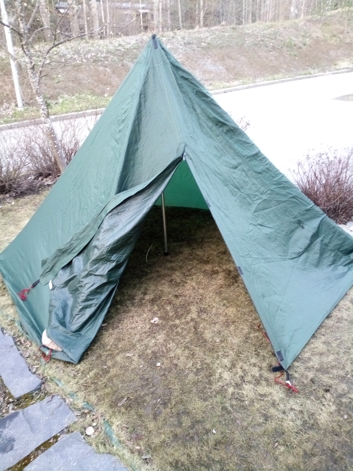 No, tämä on edennyt iltapuhteita uutisia katsellessa niin että leikkasin kaksi vastakkaista kolmiota pois ja ompelen kiinni, ja saumateippiä päälle. Teltasta tulee neliö jossa kaksi sivua kiristetään ulospäin. Tai siis se on toivottu lopputulos. ![]()