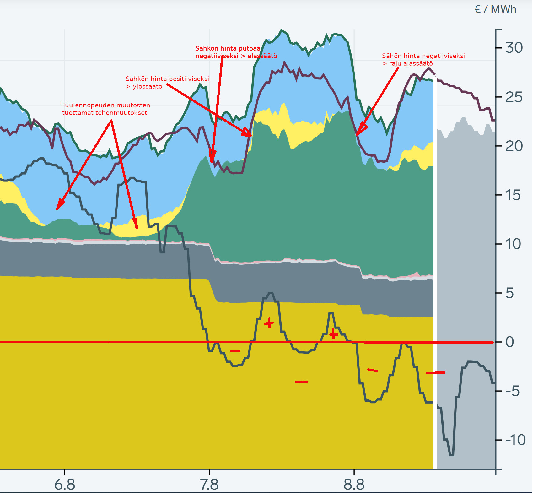 Tästä kuvasta voi hienosti huomata, paitsi helposti havaittavan ydinvoiman tehonsäädön, myös tuulivoimaloiden alassäätörampit nousevan tuulennopeuden tilanteessa. Ylempi harmaa käyrä on sähkönkulutuskäyrä ja alempi sähkön hinta. Tuulennopeuden muutosten aiheuttamat tehonmuutokset tuulivoiman kokonaistehossa ovat pehmeän rauhallisia kumpuja tehokäyrässä. Aktiiviset tehosäädöt suoria ramppeja ja paljon jyrkempiä kuin luonnon aiheuttamat.