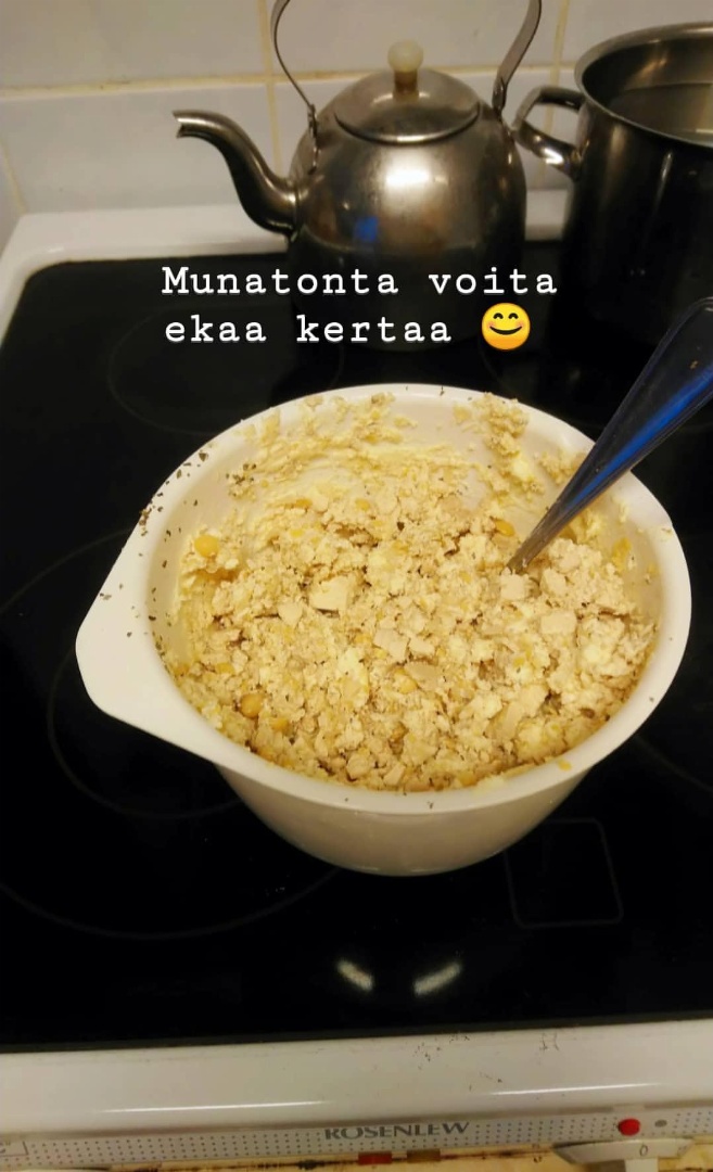 Tein tänään karjalanpiirakkaa ja kokeilin munatonta munavoita, vegaaninen versio...
