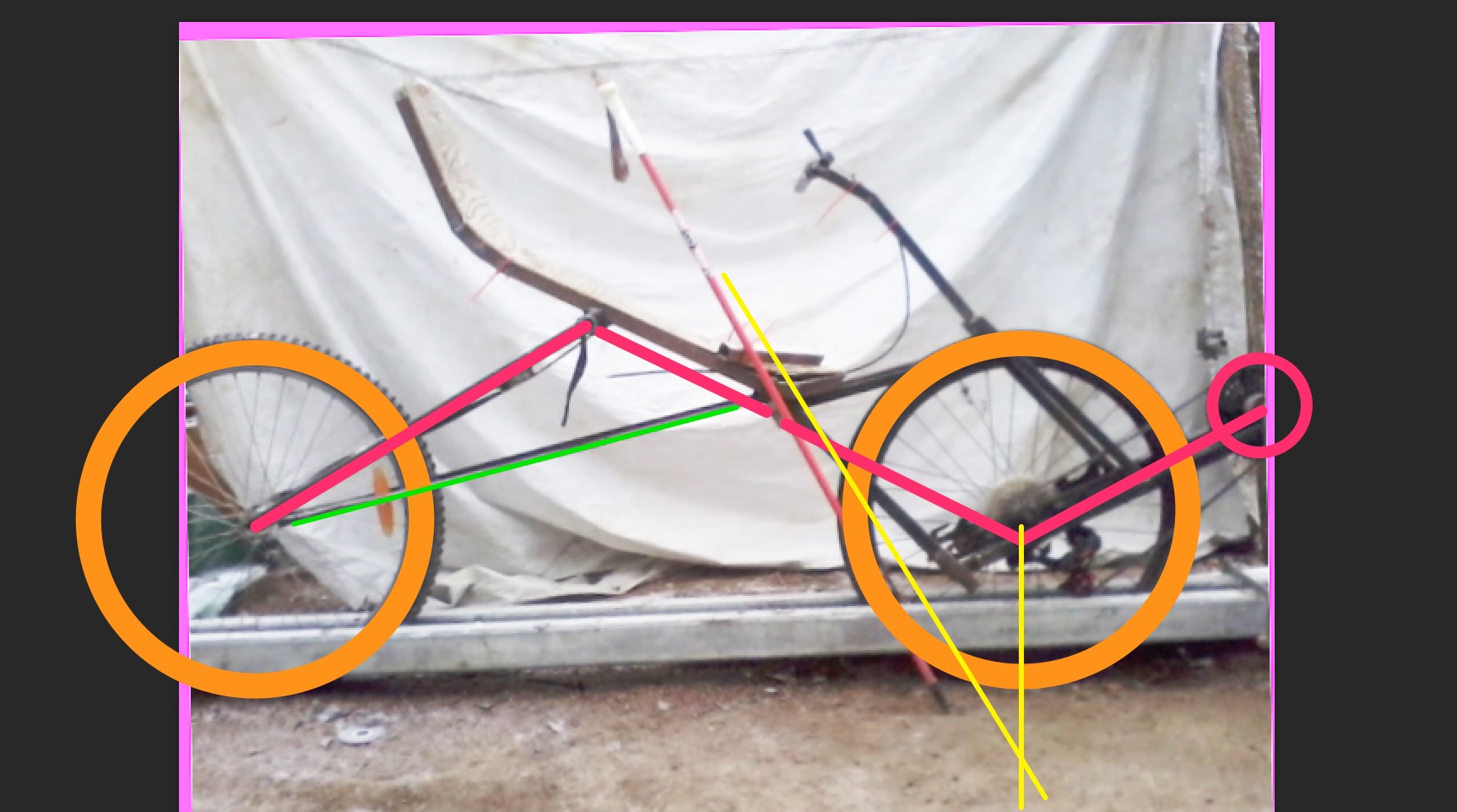 Nyt valossa asiat näyttää paremmilta, tai ainakin erilaisilta. Puristin kiekot palkkien väliin ja laskin kumitkin tyhjiksi jotta virheen mahollisuus pienenis. Löysäsin akselit droppareissa ja nyt nivel onkin lähes suorassa (hiukan sojottaa vasemmalle) - pienimmällä eturattaalla ja suurimmalla takarattaalla ketju kuitenkin hankaa rengasta joten paras tulos taitas tulla kun irrotan dropparit ja siirrän niitä 0,5-1cm vasemmalle. Tulee tilaa ketjulle ja renkaalle muutenkin.