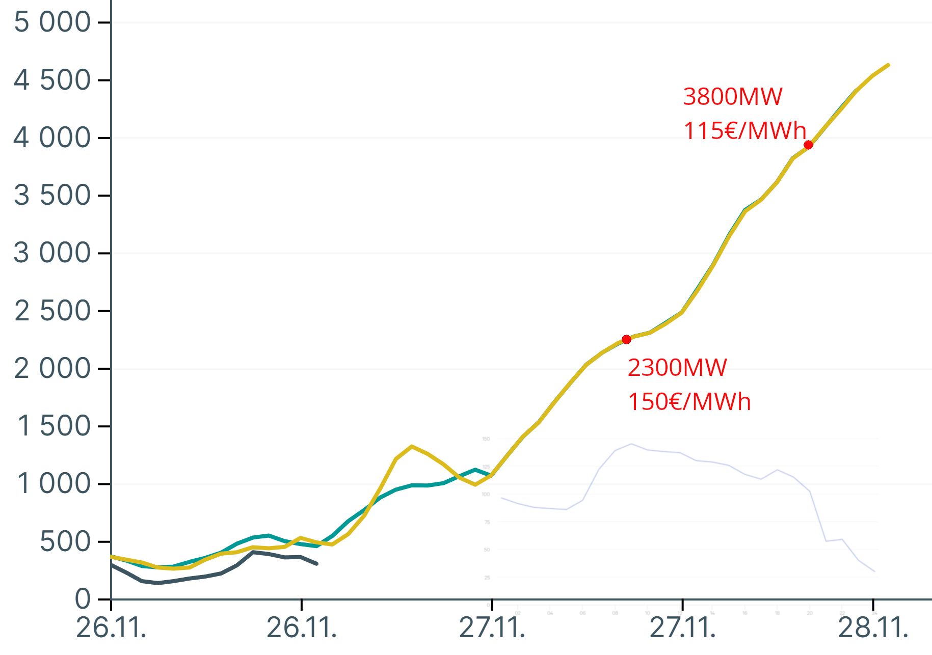 Eilen (kuvan ylempi osa) tuulivoimaa ajettiin alas viitisensataa megawattia siksi ajaksi kun sähkön hinta oli korkeammalla ja nostettiin taas takaisin, kun hinta halpeni. Tänään tehtiin sama alasajo tuulivoimaan, mutta myös Olkikolmonen käännettiin puolivaloille, eli 800 MW pienennettiin kaasua. (kuvan alempi osa). Mitä ihmettä täällä tapahtuu. TVO ei ole ainakaan toistaiseksi tiedottanut syytä, eikä tuulivoimayhtiöistäkään kuulu mitään. Nyt olisi journalismin paikka, jos sellaisia vielä jossain olisi. :roll: