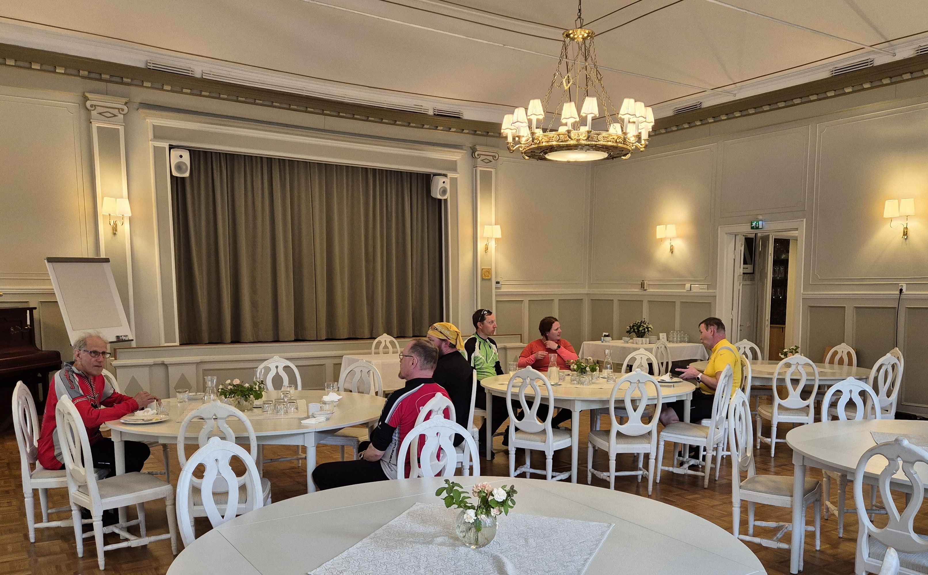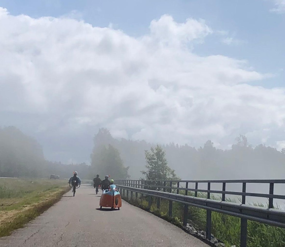 Lähdöstä kuvaa. Etualalla on kolme pyöräinen sähköavustettu käsin poljettava pyörä. Taisin ohittaa melkein kaikki kuvassa olevat.