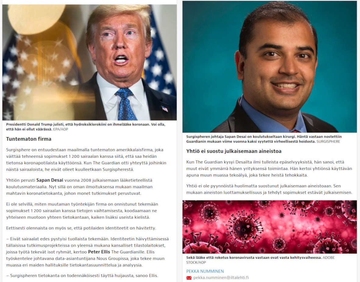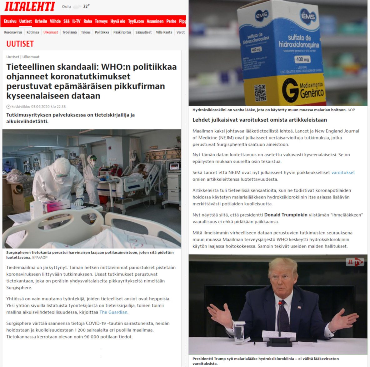 Arvelen, ettette te tätä tietoa ole useimmat mistään huomanneet, joten laitan sen tähän. Tässä kuviin kaapattuna Iltalehden artikkeli, joka kertoo olennaisimman. Myös sen, että minun lähdekritiikkini myös hydroksiklorokiinin suhteen oli se pätevämpi, vaikka sen esittäjä tuossa vaiheessa oli Trump ja vastassa oli Lancetissa julkaistu tutkimus. Lopputulos oli kuitenkin Trump-Lancet 6-0. 8)