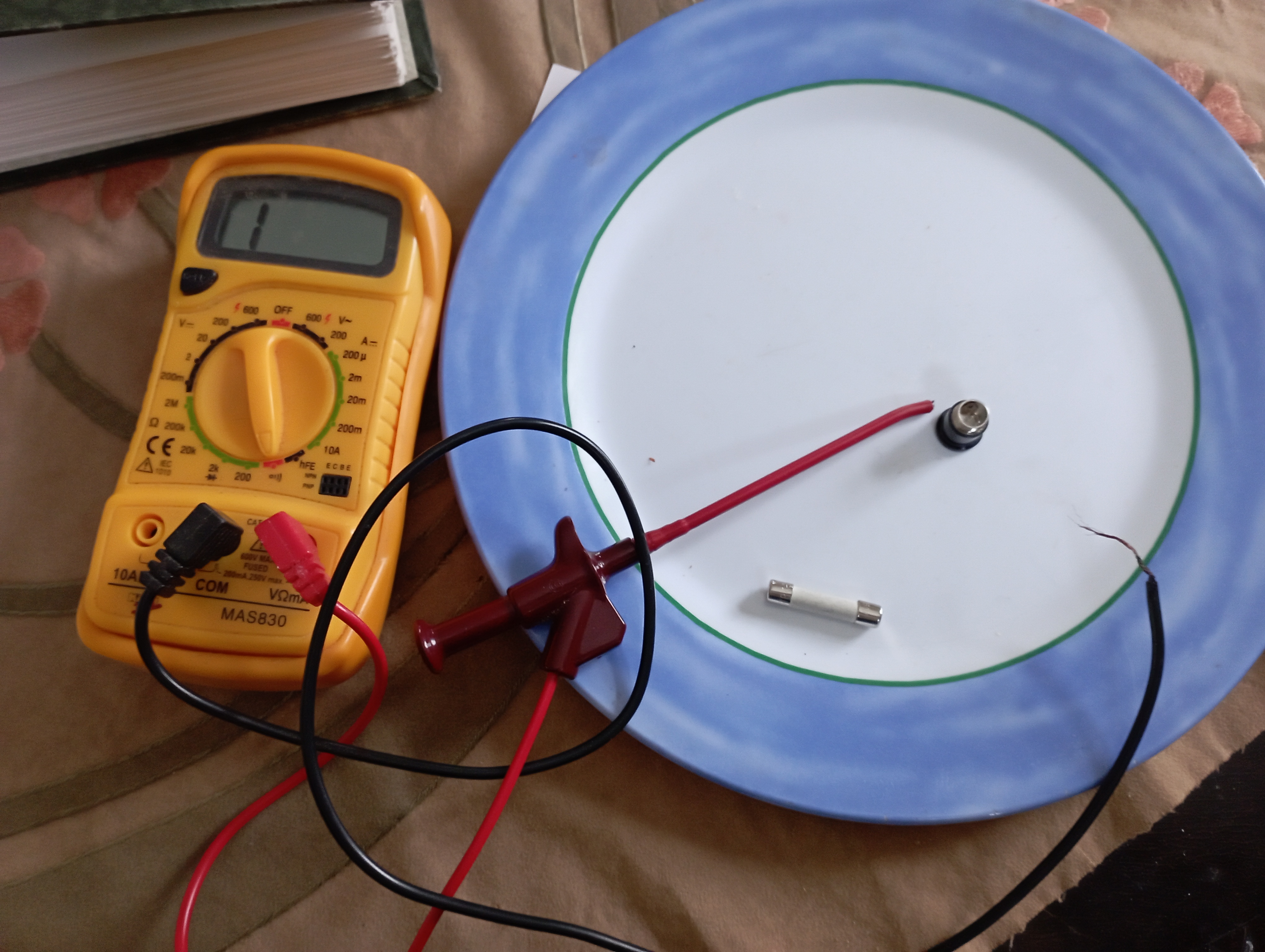 No, sähkömieslapseni ohjeella "koita piipparilla", läksin kokeilemaan meneekö sulakkeista virta läpi. Pienemmästä menee - mittari antaa äänimerkin mutta isommasta ei? Mikä tuon nyt on voinut käräyttää - en käsitä?