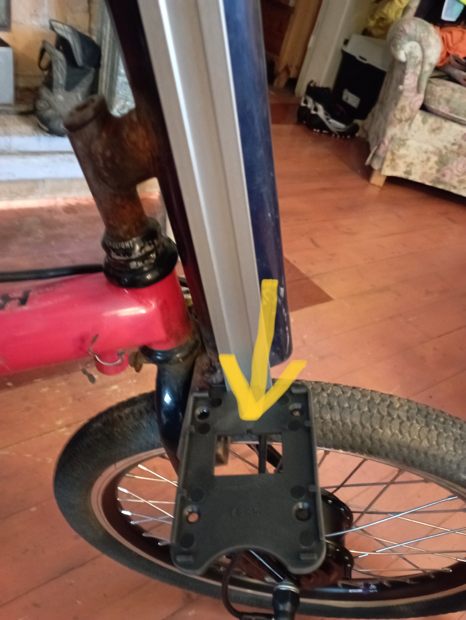 Tuossa pohjalevyssä on pikkukolo ja liittimessä on nipukka kolon täytteenä. Jos siis pohjalevy on paikoillaan, niin liitin menee vain oikeinpäin. Ja tehdasasennuksena tuo liitin on kiinteästi pyörässä paikoillaan ja akku luiutetaan päälle, joten liitintä ei pysty kääntelemään.