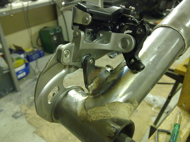 Tänään sain seisontatuen jatkettua ja sille kiinnikkeen runkoon. Etuvaihtajan tukipilari asennettuna ja etu vaihdevaijerin kiinnikkeet runkoon kiinni.