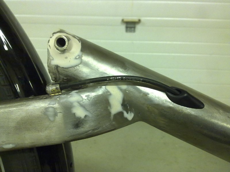 Tulinpa sellaiseen lopputulemaan hetkisen zuumailtuani runkoa ja paria veijarin kuoren pätkää, että työnnänkinpä sittenkin taka vaihdevaijerin ja jarruletkun runkoputken sisään...