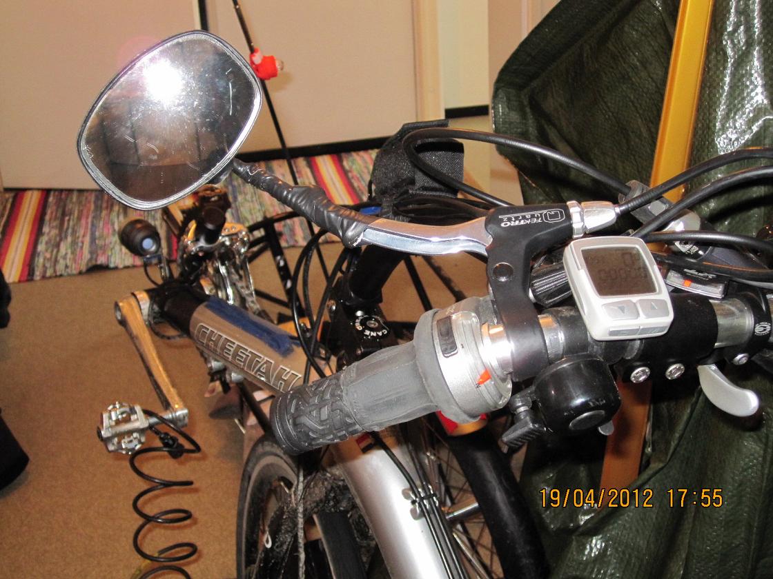 Peilin kanssa kikkailuun kyllästyin, se oli tangonpää mallia ja piti ruuvata ties kuinka monetta kertaa paikalleen kun pyörässä ei ole jalkaa ja se pitää jotenkin asetella kyljelleen tai nojalleen johonkin ja aina sen peilin onnistui tönäisemään irti. Myös takanäkymät oli rajoitetut mutta saipahan ihailla leveitä hartioita, heh heh... Teippi-Tero teippasi sen jarrukahvaan ja nyt se näyttää takanäkymät hartian yli ja näin olettaisin siitä olevan muutenkin isompi ilo, saa vaan nähdä onko peilin tärinä seuraava ongelma? no huominen koeajo sen kertoo.