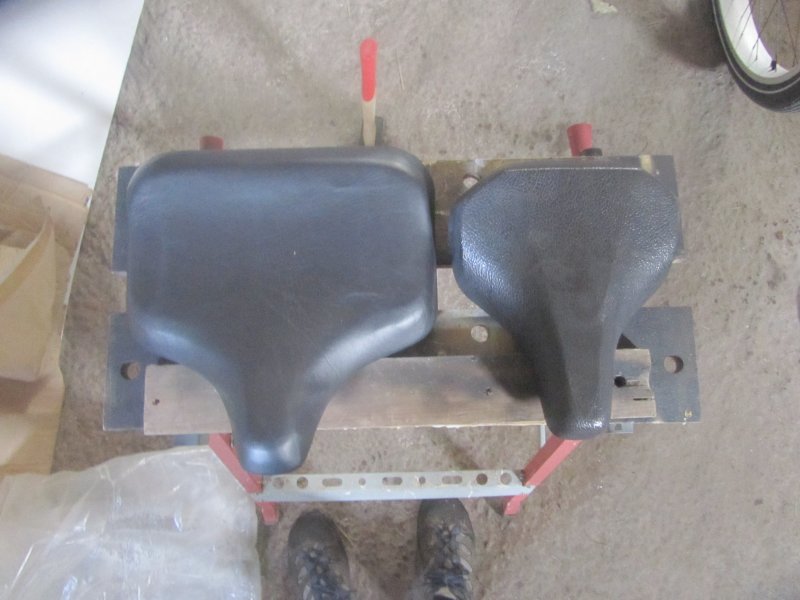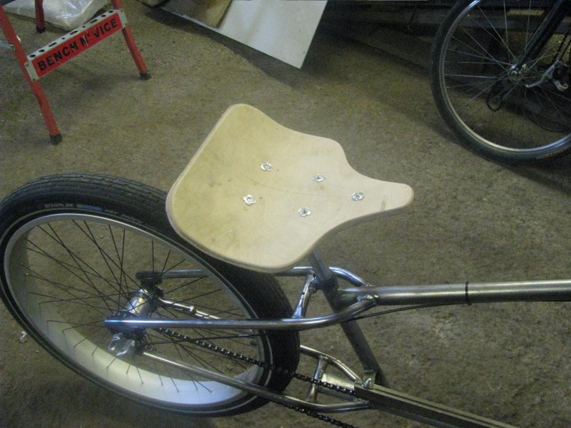 Ensimmäisessä chopperissani kokeilin tavallista marketin jousitettua mummiskan satulaa, mutta yllättäen itse tehty vaneerinen "penkki" on mukavempi.
