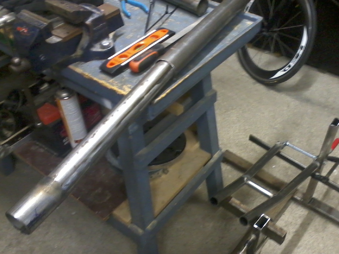 Vaikeimman kautta tehty vielä keskeneräinen jigi, takahaarukan alku, runkoputket. Sisään menevä putki piti rälläkällä katkaista sauman kohdalta, taivutella pienemmälle halkaisijalle ja sitten hitsata umpeen taas. Vain koska rautakaupasta ei löytynyt 45x1,5 putkea Ehkä turhankin tarkka sovite tuli jos haluaa väliin jotain naarmuuntumisen estävää :l mutta kokeillaan tällä nyt alkuun.