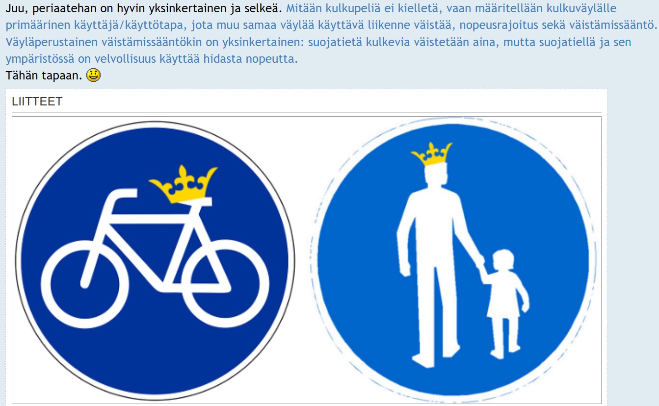 Tuota juuri tarkoitin. Shared Space toimii ja on luontevaa, mutta laitonta. Haluaisin siis, että laki muutettaisiin sellaiseksi, kuten ihmiset luonnostaan toimivat, eikä toisin päin. Siksi tuota ajoneuvomäärittelyä vastaan paasaan. :)