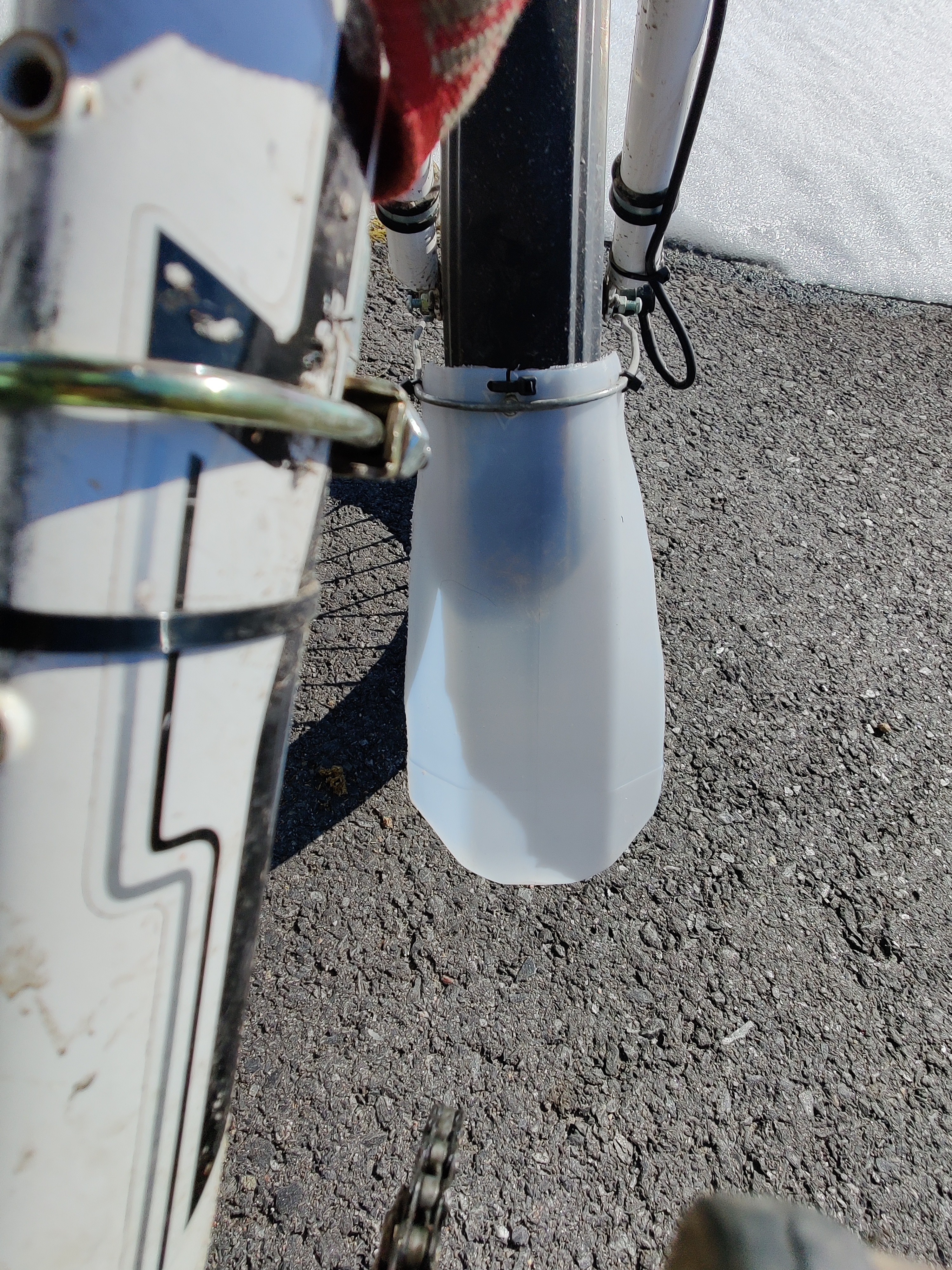 Tuulilasinpesunestekanisterista löytyy juuri oikea kourumainen muoto roiskeläppään. Halpa ja toimiva, joskaan ei aerodynamiikan huippua