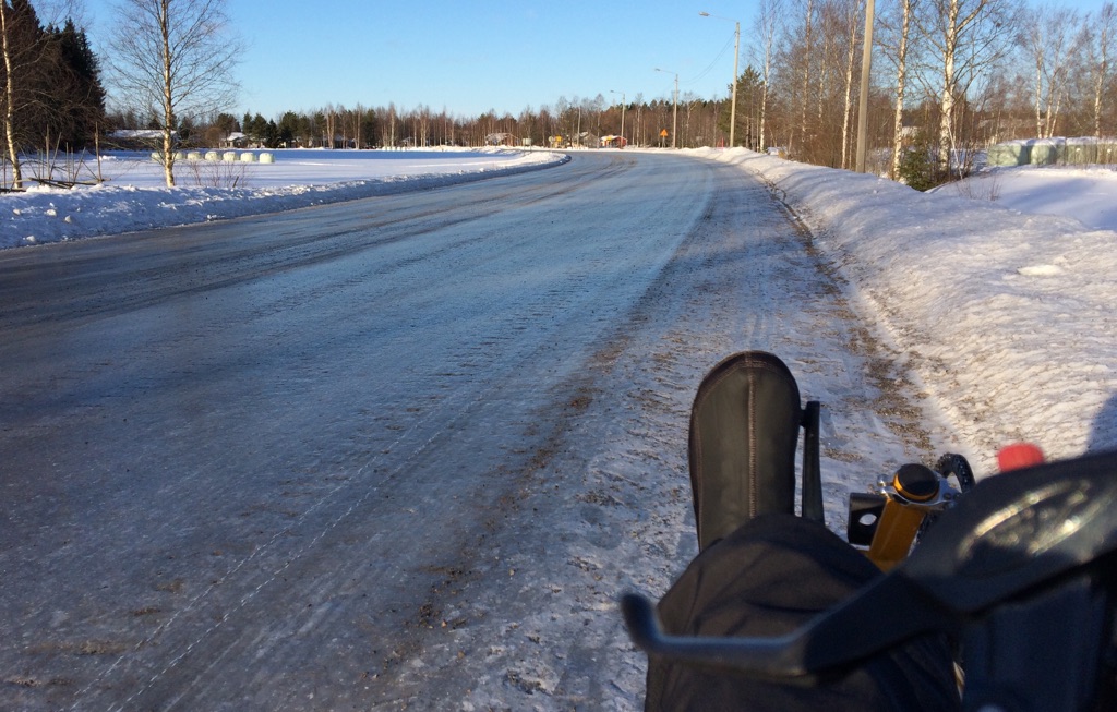 Kyllä mä lähtisin tuolle kuvan peilijäälle vain ja ainoastaan kolmipyörällä, sillä kun ei tartte miettiä niin tarkasti kaltevuuksia ja jäisen pinnan muotoja, sen ku ajaa vaan. Toki täytyy ottaa huomioon mahdollinen sivuttaislipsuma käänteissä ja kaarteissa mutta itellä ei ole vielä kertaakaan yli viiden vuoden aikana tullut sen takia oikeasti vaaratilannetta tai ojaansuistumista.