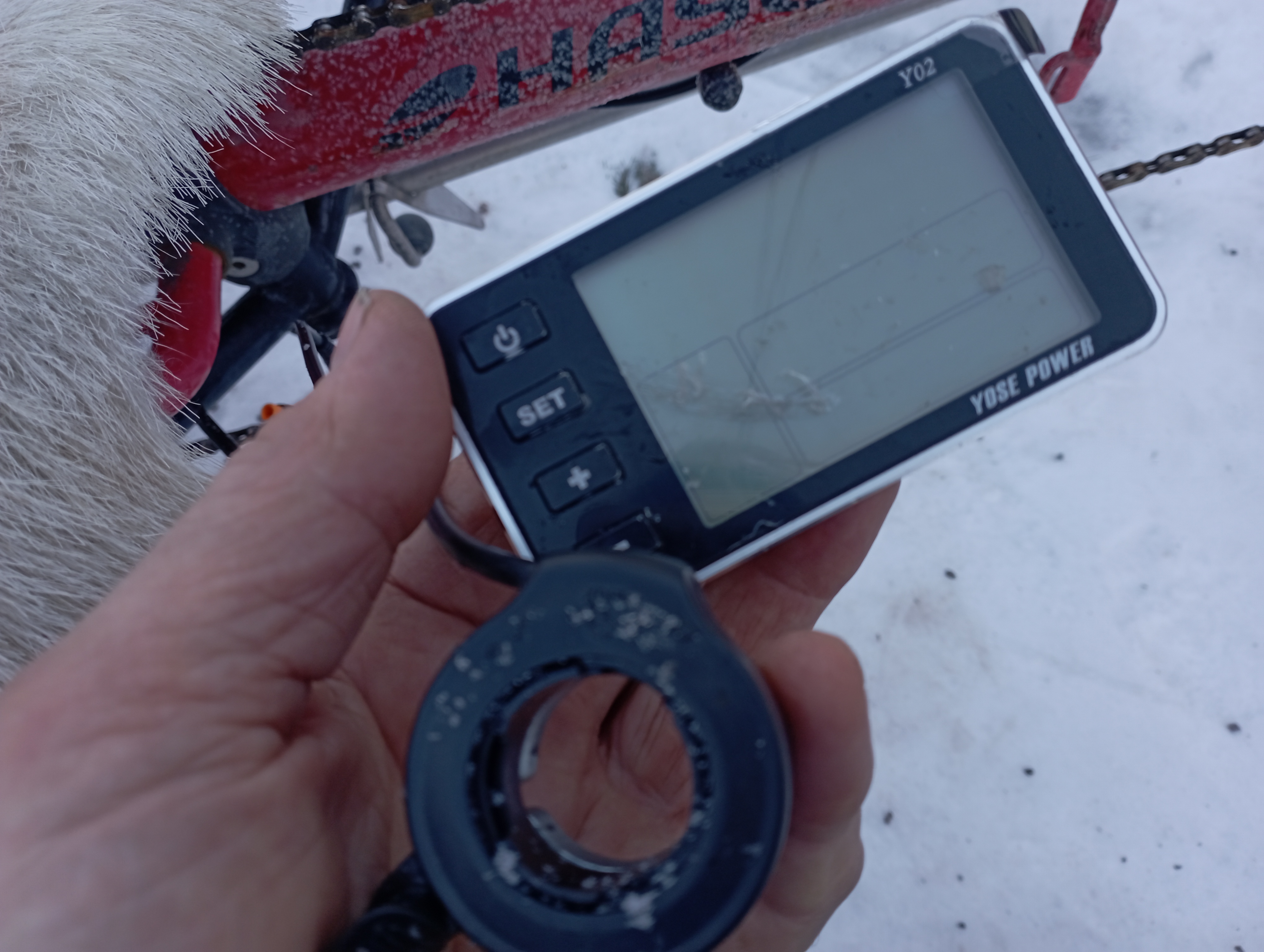 Näyttö ja peukalokaasu, nappia painettu pitkään. Nyt se nappi jo liikahtikin, aamulla tais olla jäässä.