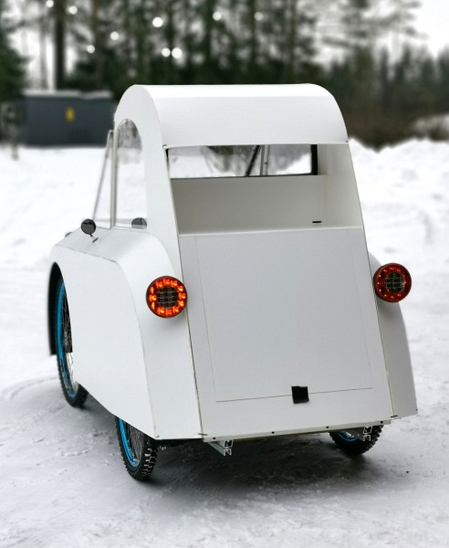 Noista valoista. Jos guttaperkkaan kiinnitetyt valot tutajavat liikaa, voisi harkita traktorimallista ratkaisua ja kiinnittää ne takajoustinkaareen läpiviennillä, joka joustaa kuoren liikkeissä. Katolle nostettuina mikkihiirenkorvina sama parkki/vilkku näyttäisi eteen ja taakse ja näkyisi toiselle puolellekin. Kenties myös ajovalot toimisivat sieltä korkealta ja jos löytyisi valasintyyppi jossa olisi kaikki toiminnot, kaksi yksikköä riittäisi.