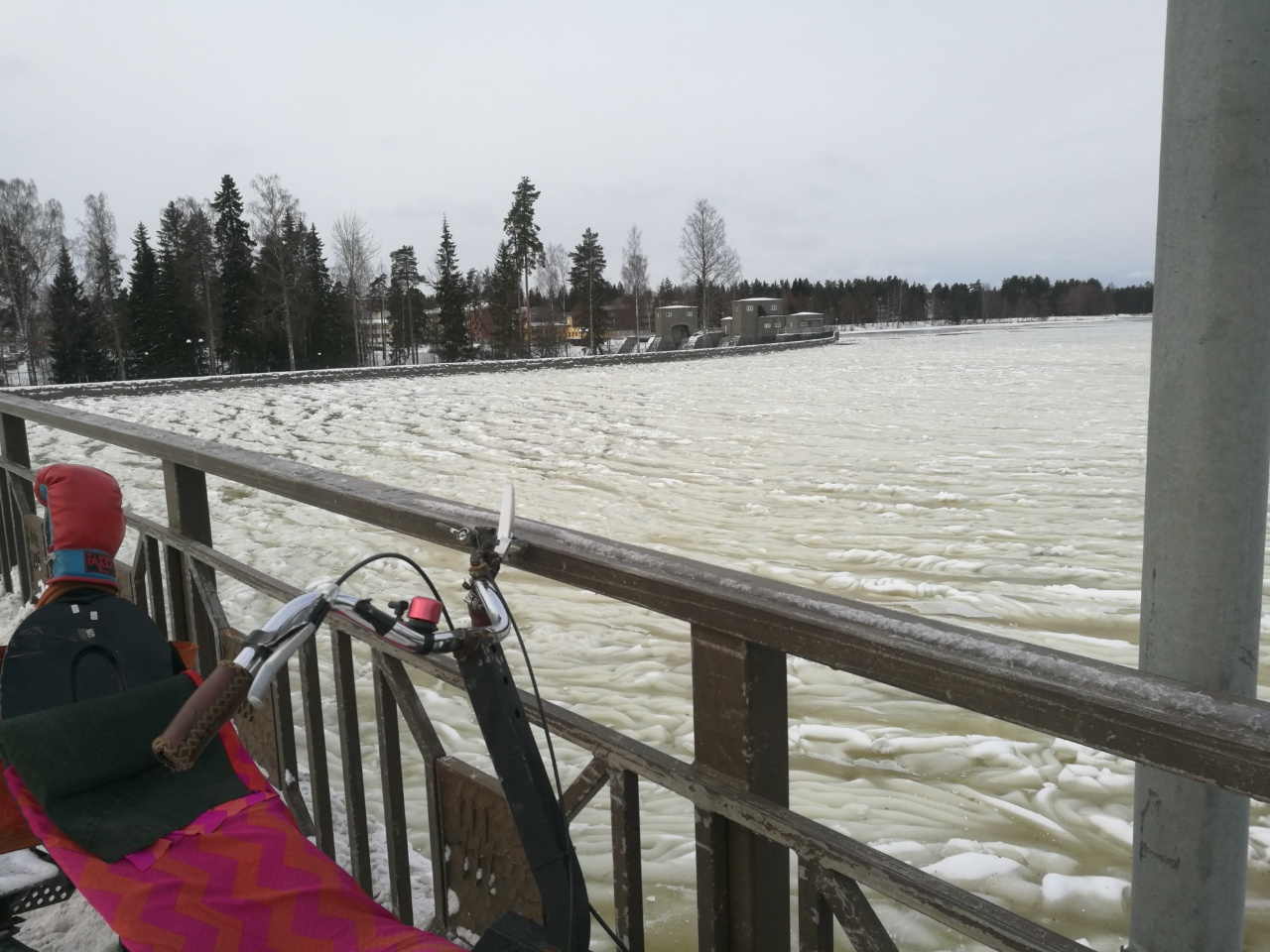 Nappasinpa kuvan Imatrankosken voimalaitoksen kanavasta kun en muista sitä tuommosena ennen nähneeni. Kuva sillalta ylävirtaan - alaspäin sillan ja voimalan väli samalla tavalla tukossa. Näinköhän on tukosta vehkeissä kun laskivat kosken padostakin vettä läpi? Kelit on ollu hyvin leudot mutt viime yönä pakkanen kävi kymmenessä asteessa - sohjohyhmä jäätynyt vissiinkin sen takia.