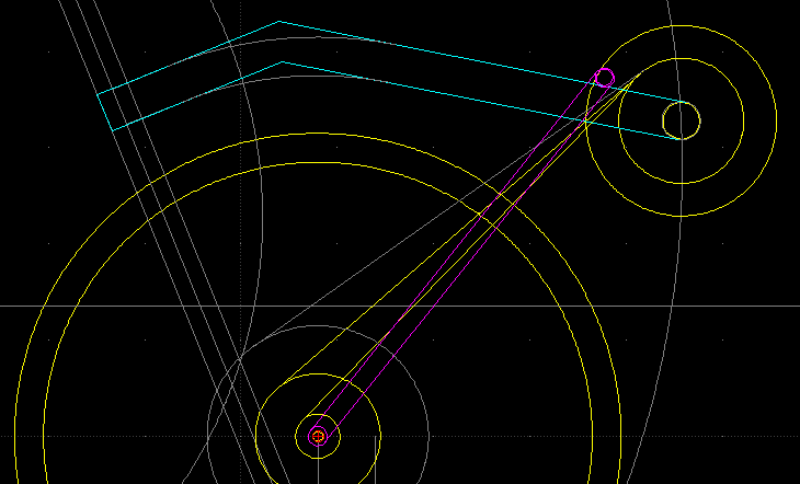 Nyt keulan suunnitelma näyttää tollaselta. Nivel on runkoputken yläpinnalla ja polkimesta polkimeen levee. Se on niin lähellä ketjulinjaa mitä nyt suunnilleen saa. Harmaa ketjulinja pitäs olla pahin mahdollinen tapaus.