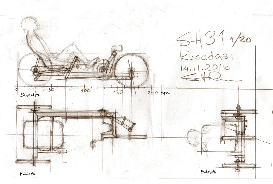 Arvelen että tämä "sivuvaunumalli" tulee olemaan paljon helpompi malli rakentaa kuin perinteiset deltat ja tadpolet. Ainoa vaativampi homma on polkimen modaus. Kippiakselin tarpeellisuutta vähän epäilen, kannattaa kokeilla ensin ilman. Voi olla ratkaisu joka tuo esiin monta uutta ongelmaa. mm. jarruhan siinä kippaa samalla ympäri. Toisaalta lisäisi varmaan keskustelua täällä foorumilla joten...
