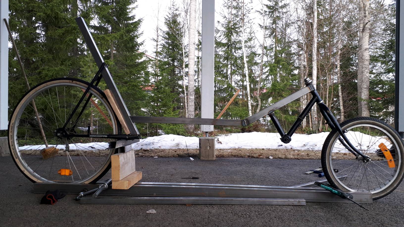 Tämän vois tehdä uudestaan. Alkuperäinen ajatus oli hyvä, mutta toteutus huono. Pystärin penkki ei oo hyvä, ashtabula kammet on liian pitkät ja risukeula tekee ajotuntumasta kummallisen raskaan.