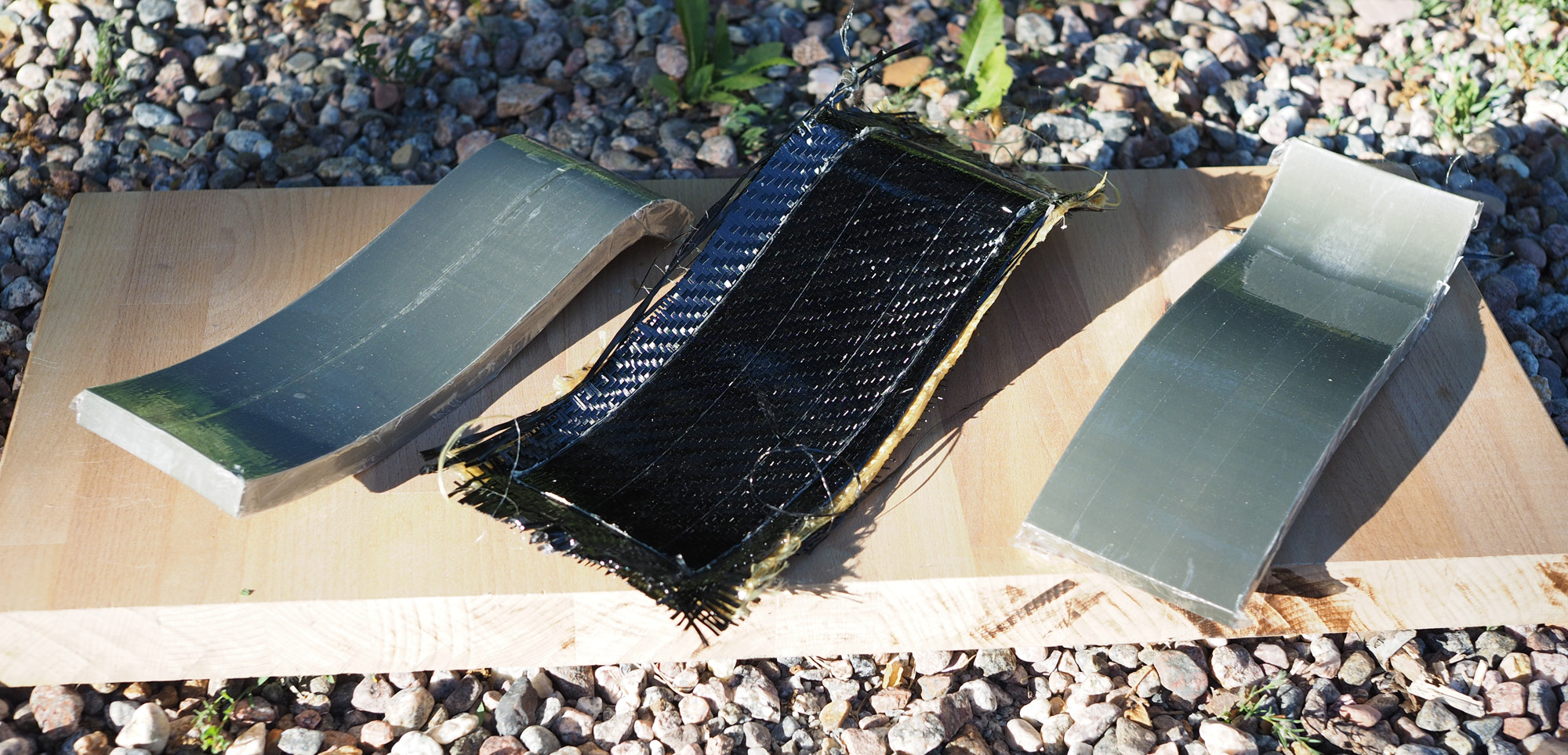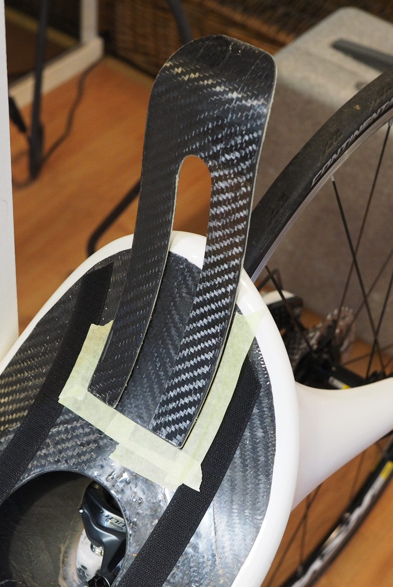 Väsäsin niskatuen. Lyhyemmän lenkin jaksaa ilmankin mutta 10 km jälkeen alkaa itsellä tuntua jo väsymystä niskassa tällä nojakulmalla. Vanhassa pyörässä käytin taivutettua polykarbonaattia joka toimii hyvin mutta on tähän pyörään liian painavaa ja paksua. Tukea ei luonnollisestikaan saa penkin taakse piiloon, joten sen täytyy olla tarpeeksi ohut ettei tunnu pehmusteen alta. Päädyin hiilikuitu-kevlar-yhdistelmään seuraavanlaisesti laminoituna: