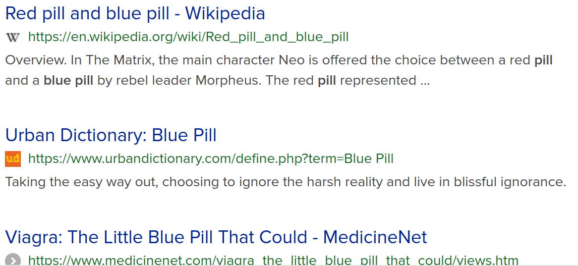 Heh. Minulla meni kauan, ennen kuin ymmärsin, että kyse oli Pfizerin, eikä Morpheuksen sinisistä. Jännästi sinisillä pillereillä on nykyään enemmän poliittinen, kuin farmakologinen assosiaatiokehys. Farmakologisessa mielessä pitäisi kai puhua "Pienistä sinisistä pillereistä". Molemmat viime vuosituhannen lopulta. Tässä minun hakutulokseni "blue pill"-haulla: