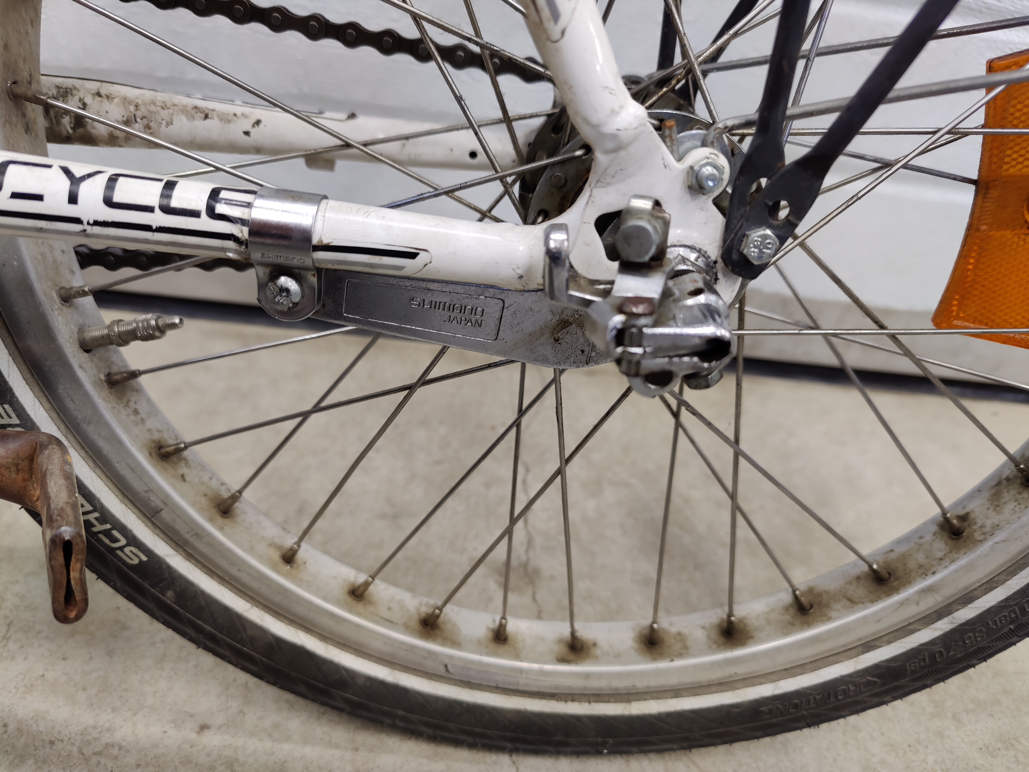 Takanapa on vanha 3 vaihteinen Shimano, jossa kilck box on vasemmalla ja siinä kuuluisi olla "pianolanka" vaihdevaijeri, jolla voisi myös työntää. Eipä ole sellaista hyllyssä, joten vaihteenvaihtoon pitää pysähtyä