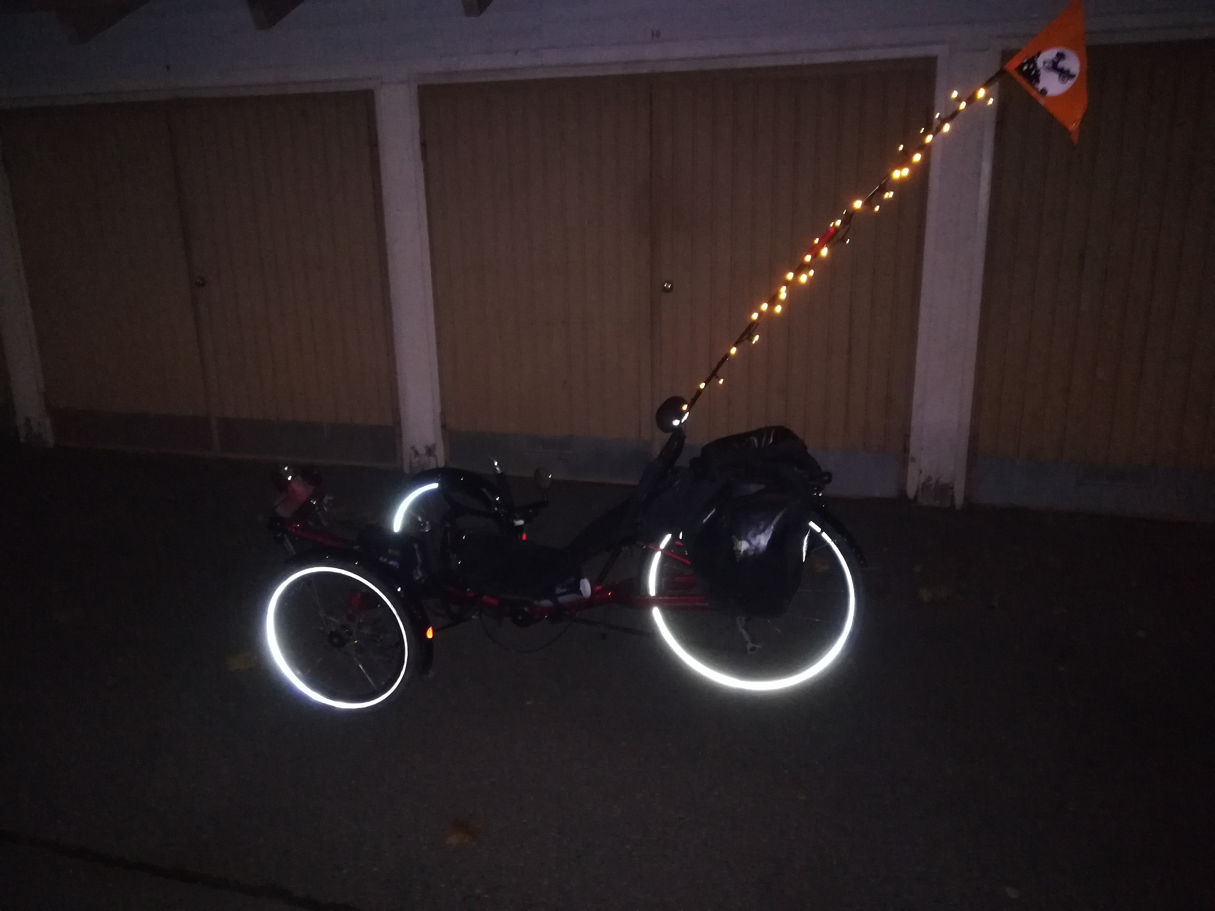 Minä olen käyttänyt triken viirissä tuollaista pattereilla toimivaa jouluvalosarjaa. Näkyy hyvin, laillisuudesta en tiedä.