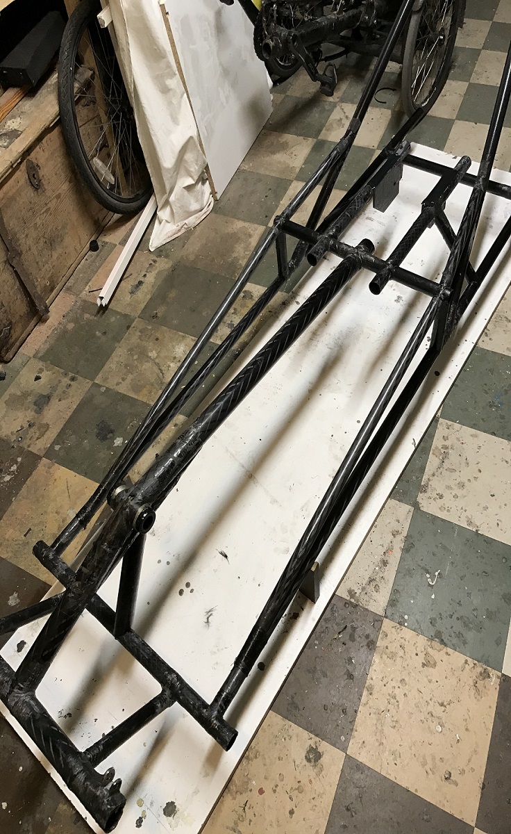 Jorilta oikea huomio, ei mikään. Runko ei ole valmis, keskiön paikkaa vielä mittailen. Keskiö tulee tuetuksi ainakin kolmeen suuntaan, eteen, alas ja taakse ketjuvoimien suuntaan eli keskiöstä vielä putki istuimen alle. Tai jotain mitä sitten keksinkin. Lisäksi ketjuvoimat vääntävät runkoa kun ketju ei ole aivan keskellä, tarvittaisiin vinotukeakin...