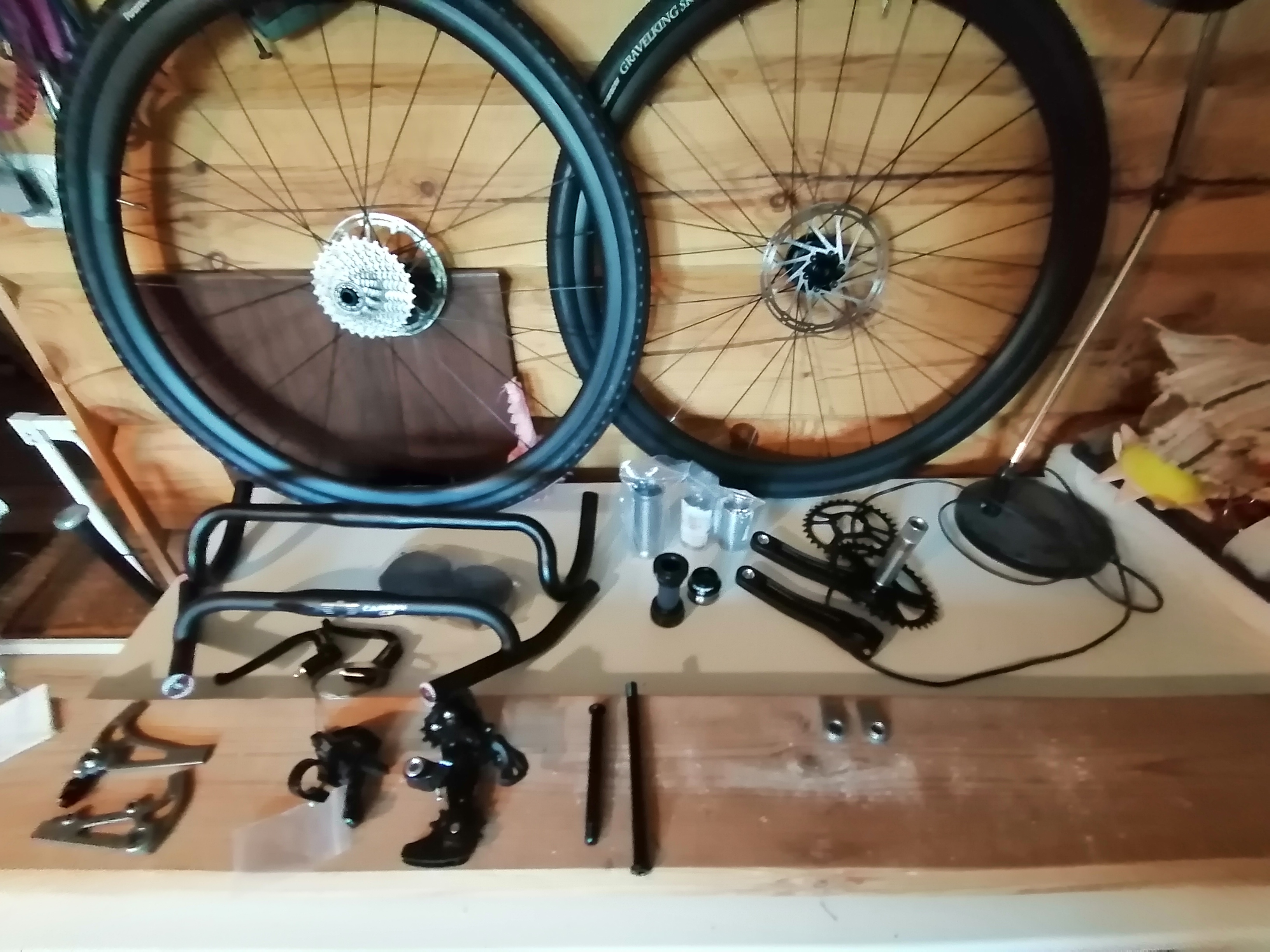 Tori.fi:stä on hankittu kiekot kumeineen ja jarrulevyineen sekä tuo takimmainen pässitanko. Englannista tilasin kuvan vas. laidassa laudan päällä olevat etu drop outit ja jenkeistä tuli hankittua oik. olevat taka drop outit. Jenkeistä hankittu myös ohjainputki ja keskiöt (varuiksi 2 kpl eri mittaisia). Loput hankinnat taitaa sitten olla Kiinasta (saita), jotta pääsee kokeilemaan ennen kuin hankkii kunnon tavaraa. Sieltä sai myös 155mm kammet. Toinen etuhammasratas on omasta takaa SRAMin 32 hampainen ja lisänä tuo kiinan 36 hampainen, jos vauhti ei riitä heti alkuun :oops:.