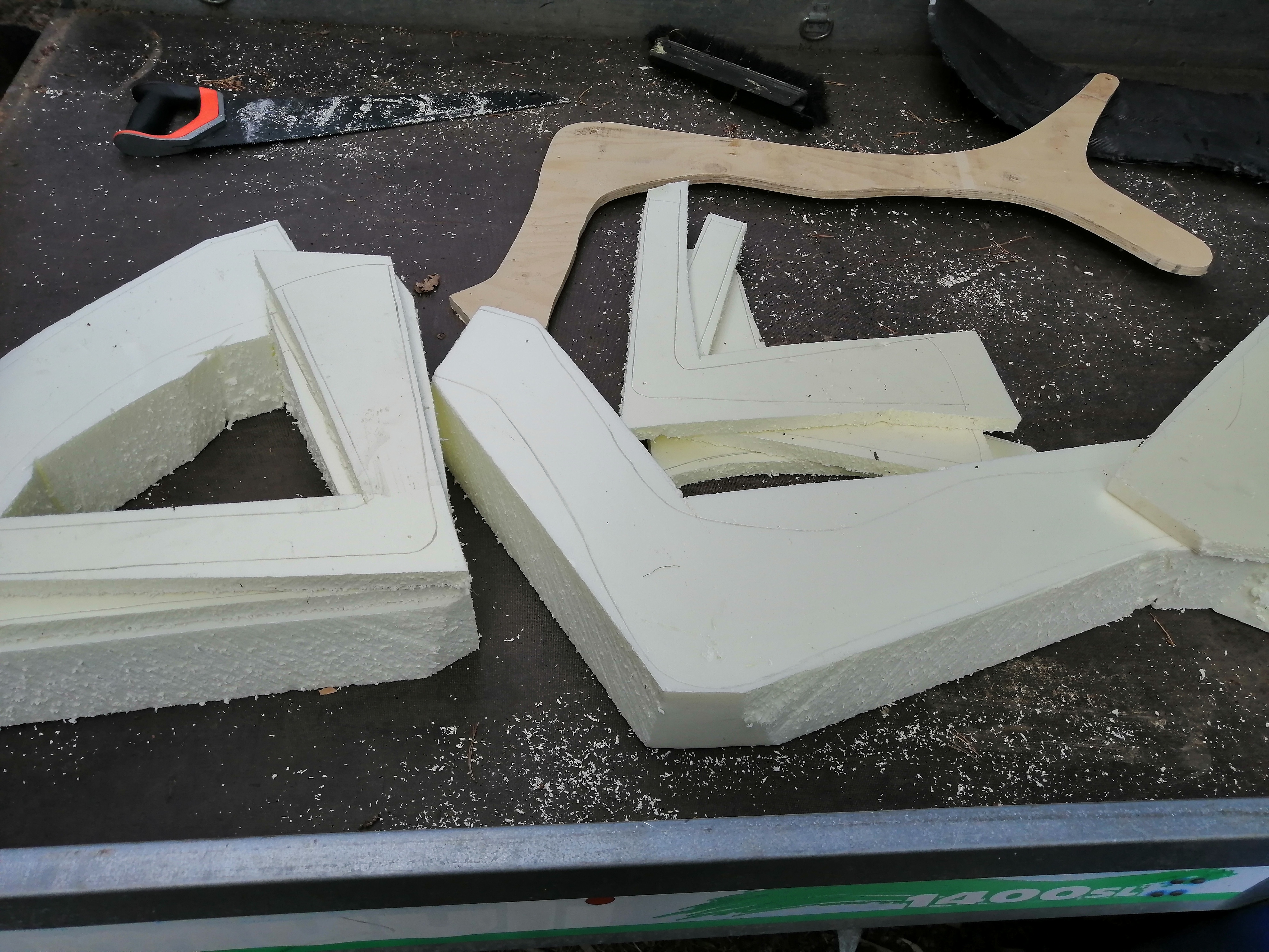 Finnfoam aihiot tuli leikkautua tänään. Aihion kokonaispaino nyt noin 1,5 kg, mutta siitä lähtee yli puolet pois kun olen saanut hiottua kaiken kohdilleen. Tietenkin tuo ylimääräinen paino varmaan v....ttaa noissa muutamissa yli 6 asteen nousuissa mitä tuossa matkalla on. Onneks pituudet eivät kuitenkaan ole mahdottomat.