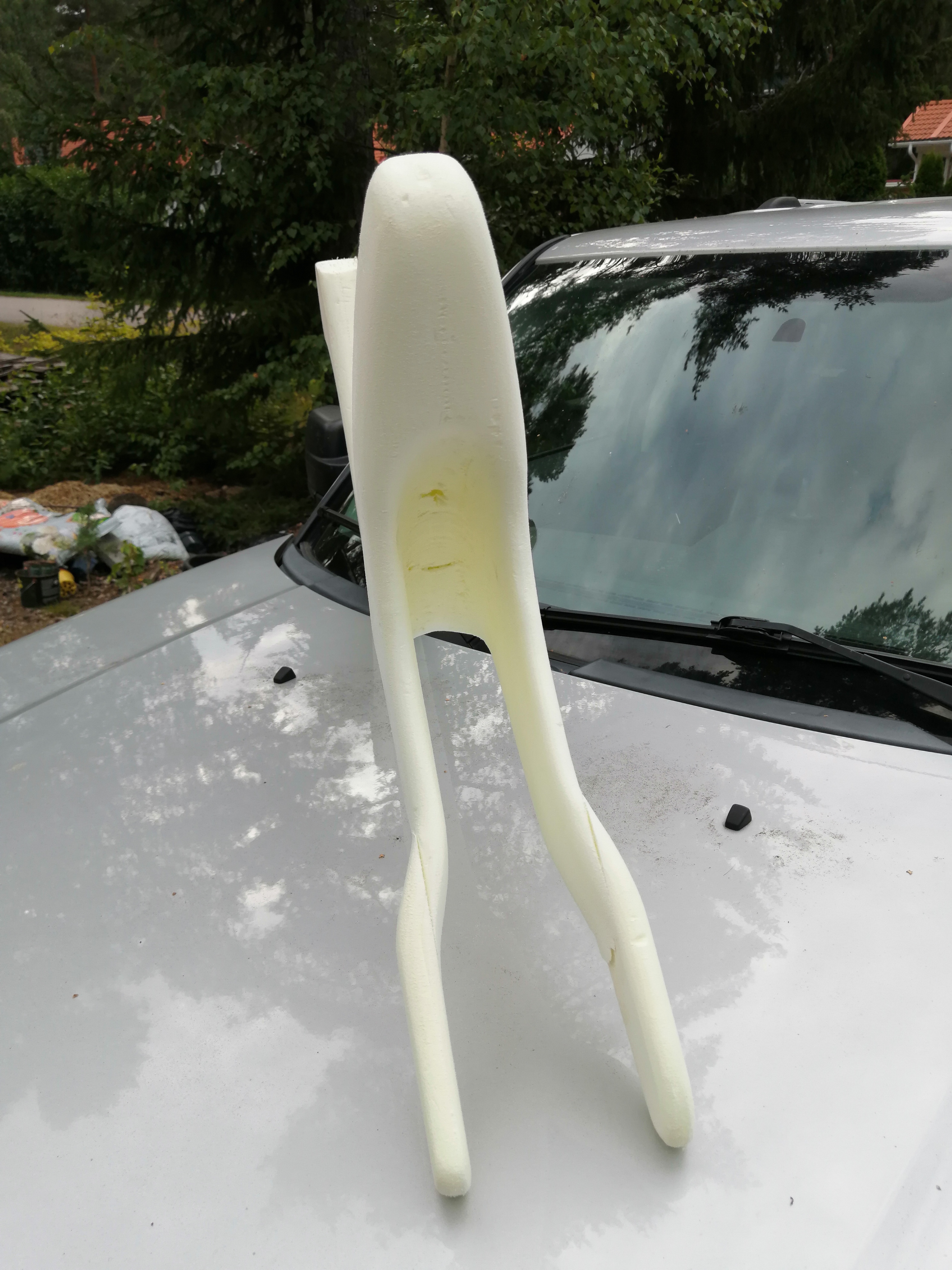 Hyvin etenee projekti. Noin pienistä painoista en välittäisi. Useimmilla polkupyörällä ajavilla ihmisillä on vyötäröllä useampi kilo, joiden pudottaminen ei maksa tuhansia euroja, kuten kilojen pudottaminen itse polkupyörästä :D ja luulisi Finnfoamiakin voivan liuottaa jollain kemikaalilla, jota valmis komposiitti kestää.