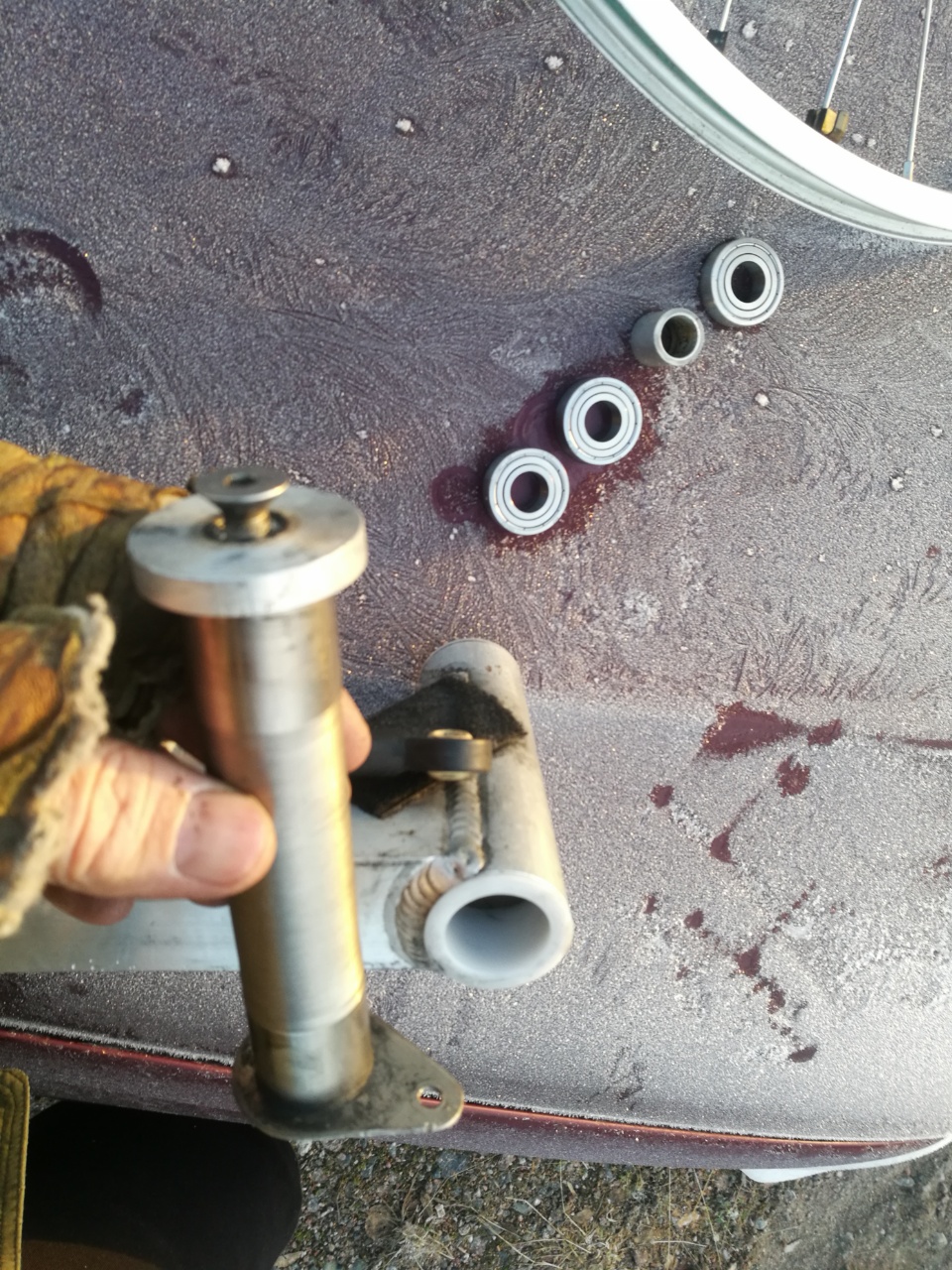 Voitele rasvalla tuo akseli ennen kuin työnnät paikoilleen, niin estää vähän ruostumista ja lähtee paremmin irti, kun pitää joskus irrottaa.