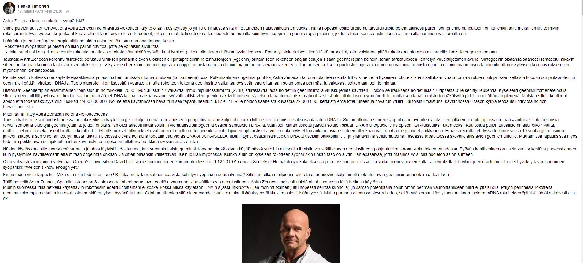 Mahdetaankohan noteraata mitenkään missään tätä lääkärin ja biokemistin ulostuloa. Omien sanojensa mukaan entinen geeniterapiatutkija. Lähteitä tuo ulostulo kaipaisi kipeästi. https://m.facebook.com/story.php?story_ ... 0575171807