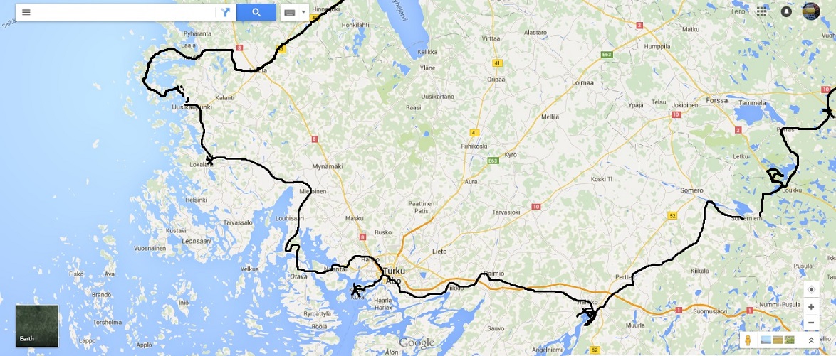 Karttoja piirrettynä suurinpiirtein reitistä, jotain sotkua tai x on yöpymispaikan kohdilla.
