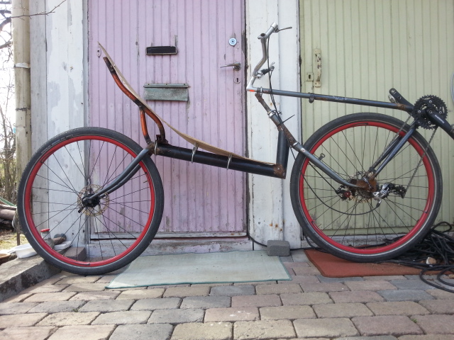 Pyörän asettelin jigiin mutt homma jämähti kun en löydä sopivaa etuhaarukkaa. Jokunen kapee haarukka on mutt niissä on liian lyhyt kaulaputki. Emäputkee vois tietyst lyhentää mutt leikkauspinta jäis kuitenkin vinoks, joten jatkan viel etsimistä. Harmittavan paljon on eri mittoja polkupyörän osissa :? Jossain kohtaa se voi olla hyväkn asia ;)