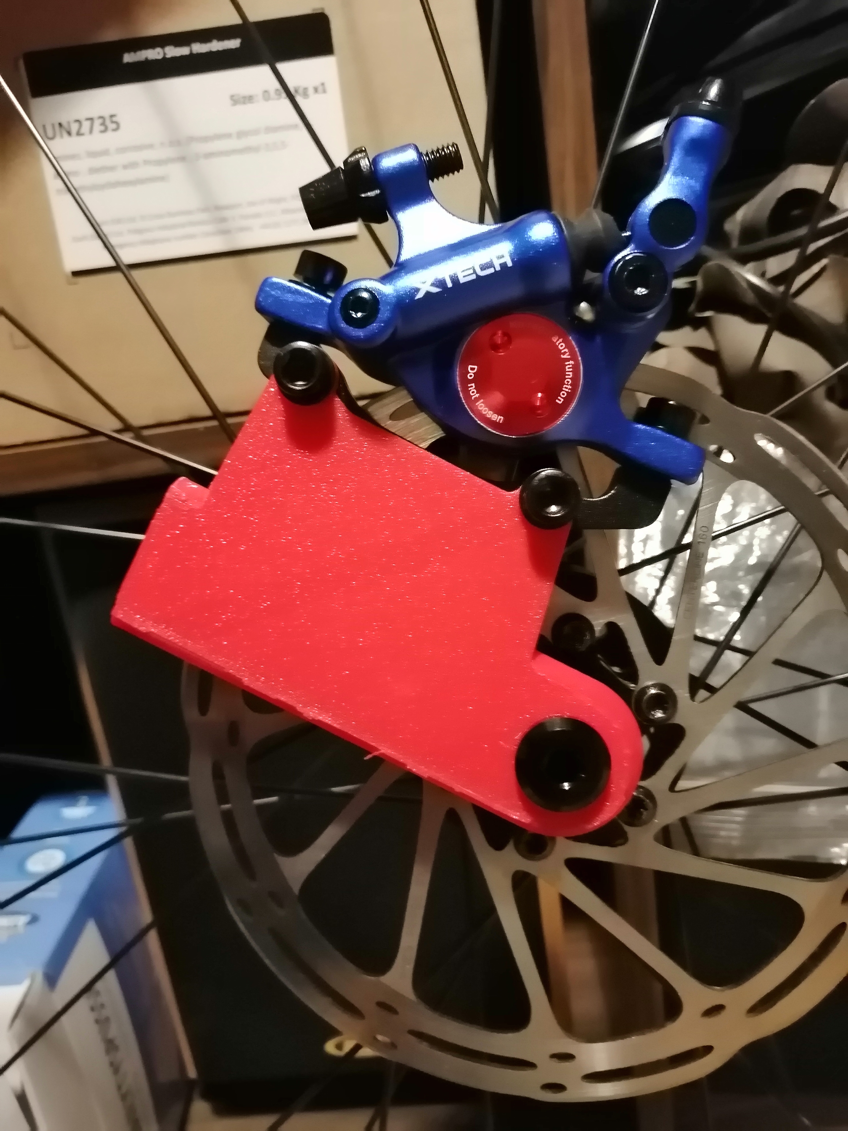 Tuli hankittua aloittelija tason 3D-tulostin. Pitihän se heti koittaa, että miten FreeCad ja tulostin pelaa yhteen. Tuloksena vasemman takahaarukan loppuosa jarrusatulakiinnityksen kera. Mitoitus osui nappiin. Tämä on siis vasta mallikappale, jotta tiedän miten edetä.