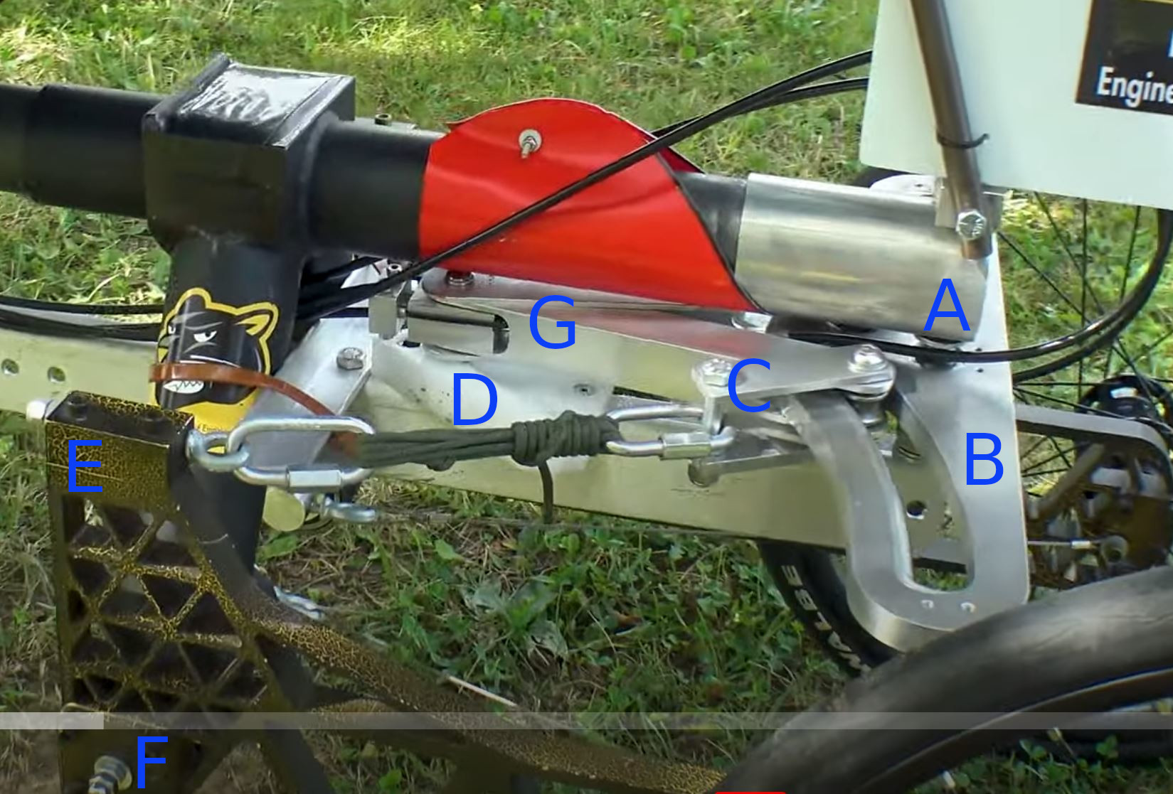 Kun ohjausvarren liikkeellä liikutetuilla vaijereilla liikutetaan V-muotoista, seuraajarullia liikuttavaa, mekanismia G taakse (kuvassa oikealle), työntää aukeava V-mekanismi seuraajia ulommas kaarevilla radoillaan ja takapyörien heilurivarsien ja vauhtipyöräheilurin välityssuhde pienenee. Kun seuraajat ovat lähellä vauhtipyöräheilurin akselilinjaa, sen kulmanmuutokset ovat suuria verrattuna takapyörien heiluriliikkeisiin, jolloin pienikin pyörän kallistuminen vaatii tuon mekanismin kautta suuren liikkeen vauhtipyöräheilurilta ja näin hidastaa pyörän kaatumista.