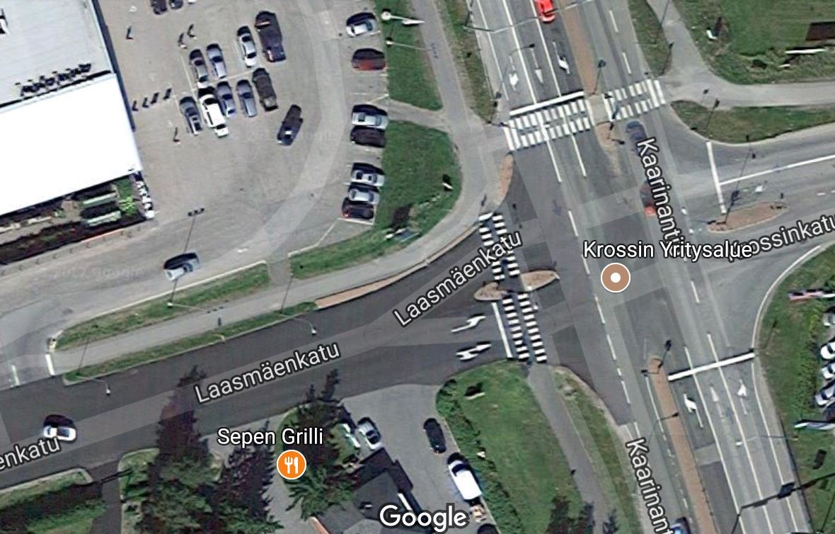 Laitetaan vielä lintuperspektiivi tuosta risteyksestä, kun tuntui työkaveri saaneen aivan väärän kuvan tekstistä. Syy siihen, että pyöräilijä jäi rekan perävaunun alle, on tuossa loivasti kaartavassa liittymässä. Kuorma-auto ja pyöräilijä tulevat kuvassa ylhäältä summittain samaa vauhtia. Kun kuorma-auto näkemättä pyöräilijää kaartaa oikealle, pitää pyöräilijän yrittää jarruttaa vauhtinsa pois. Jos jarrutus menee pitkäksi päätyy hän perävaunun alle. Ja vaikka ehtisikin jarruttaa vauhdin pois, oikaisee perävaunu kaarteen ja jyrää pysähtyneen pyöräilijän, vaikka ensin näytti, että ehti väistää. :shock: