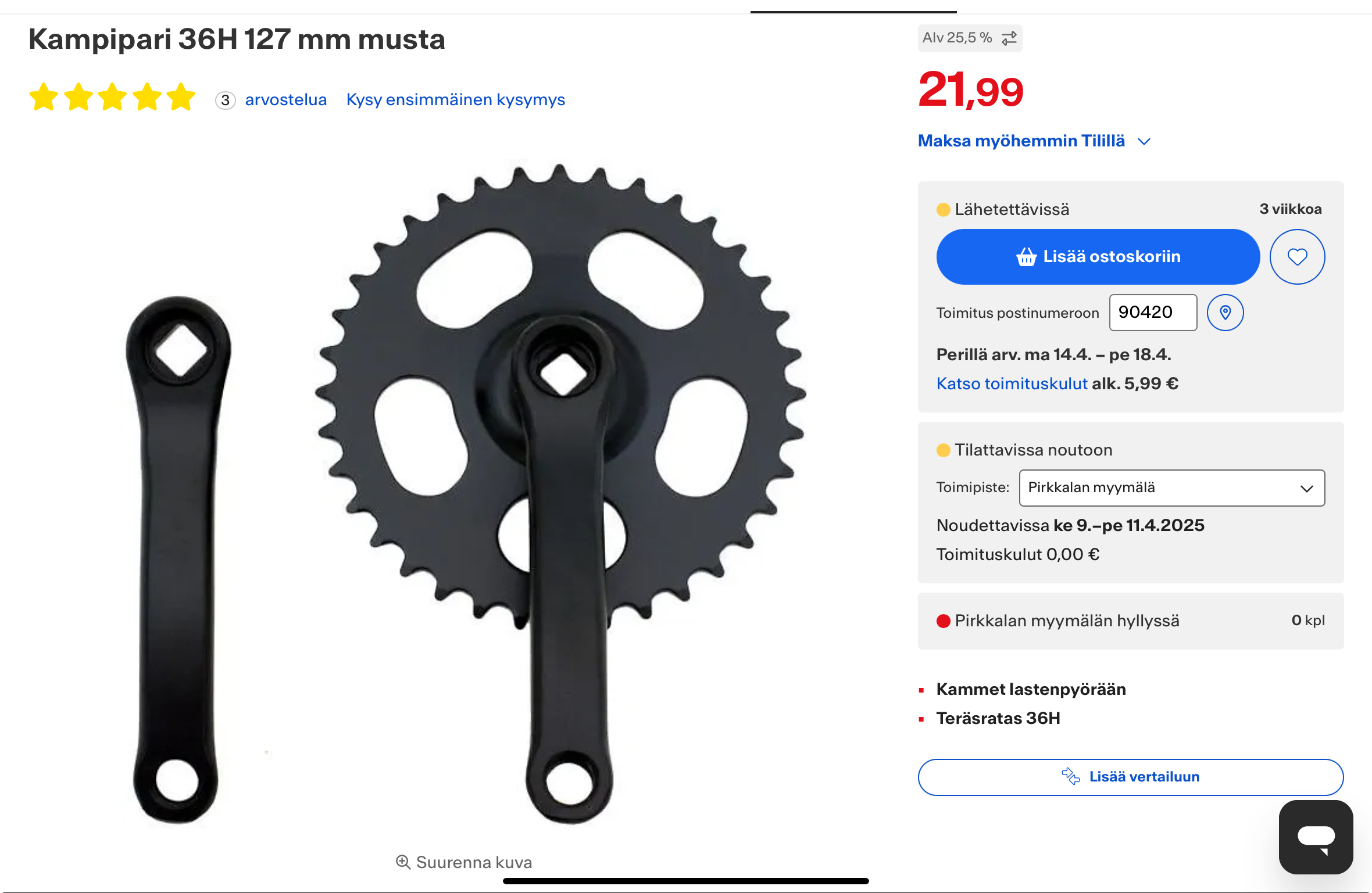 Työkaverille möin ajatuksen lyhyistä kammista sähköpyörään. Onkos kenelläkään tietoa halvoista 102-millisistä nelikanttikammista noin 30 hampaan rattaalla. ![]()