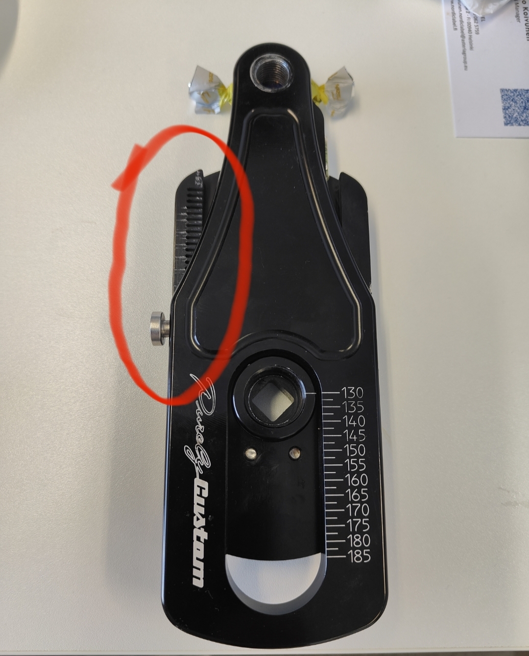 Tosiaan sain nuo Purely Custom säädettävät ( 130 - 185 mm.) nelikantti kammet käsiini eilen. Laatu tuntuu vakuuttavalta painoa myöden sillä parit vahvat kirjekuoret päällä paketin rahtipaino oli 1,45 kg. Nämä myytiin pieni vikaisina eli jousitetun lukitustapin vieressä olevat muoviset pultit, jotka kiristävät välyksen, ovat rikki ( toisesta jämä jäljellä, toinen puuttuu kokonaan). Näitä pystyy säätämään lennosta ilman mitään pulttien säätöä painamalla tuota sivussa olevaa tattia jolloin kelkka lähtee liikkeelle säätyäkseen 2,5 mm. välein sille pituudelle mitä haluat.