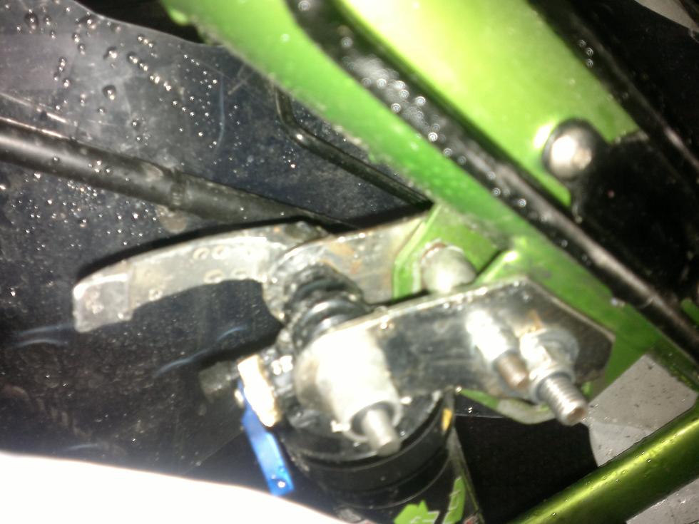 Tässä lupaamani kuva jousen kiinnikkeestä, se on kiinni kahdella pultilla vanhassa iskarin kiinnikkeessä ja vanhan kiinnikkeen sisään/pultteíhin laitoin holkit, ettei vanha kiinnike painuisi länään. Tuo iskari on vähän pitempi ja nyt kun iskariin laittoi "sopivasti" (muistaakseni 12,5bar, ihan mututuntumalla mennään) ilmaa niin se ei juurikaan painu kun istahtaa jakkaralle mistä johtuu se, että ajoasento ja muuttui pystymmäksi ja istumakorkeus tuntuisi olevan vähän korkeampi kun vertaa vanhaan. Ylösalaisin asentamalla (kuten vanha) tuo mahtuisi paikallee vanhaan kiinnikkeeseen mutta mun mielestä kaikki kurapaska olisi ajanoloon menossa iskarin sisään, tiedä sitten olenko vaan vainoharhainen? "kesäkiinnikkeet" vielä teen sellaiset missä ajoasento on aavistukseen makaavampi.