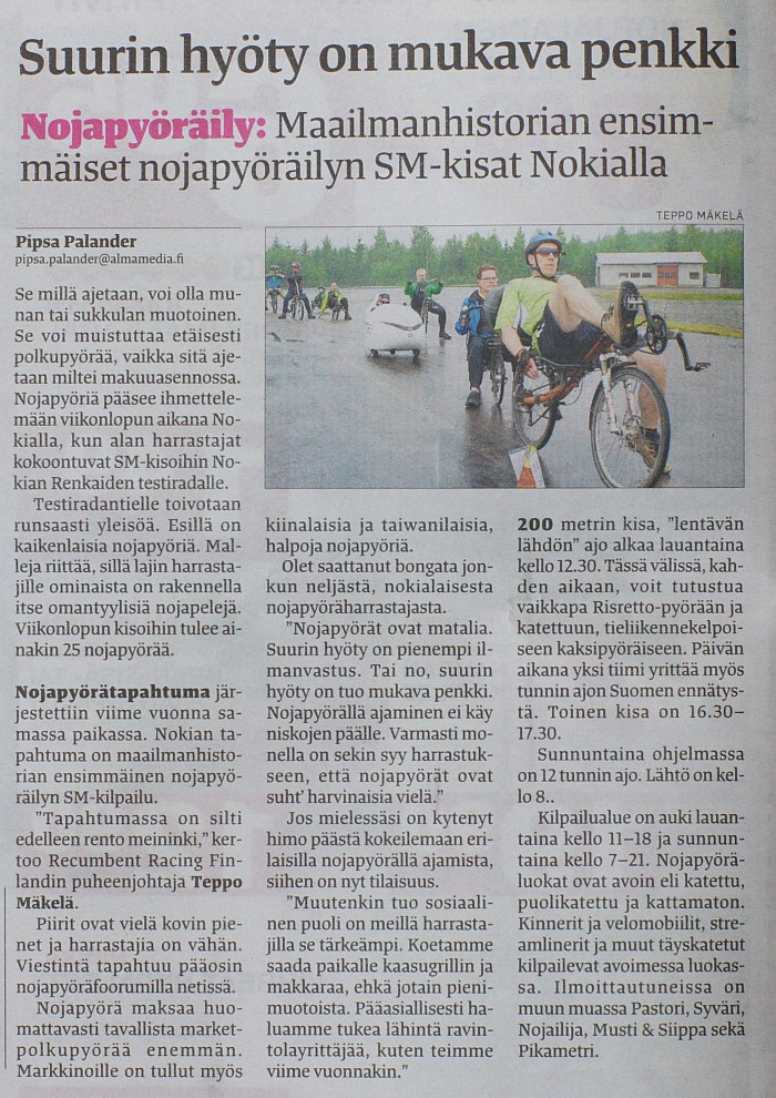 Nokialle saadaan ripaus kansainvälisyyttä, kun näillä näkymin lauantaina iltapäivällä paikalle saapuu belgialainen Siegfried -niminen kaveri VeloCraftin omistamalla Mangolla. Siegfried on kiertämässä Suomea, ja on sopivasti näillä nurkilla viikonloppuna, siispä mies yöpyy VeloCraftin Pieterin mukaan Alisniemessä. Pieterin sivuilta (http://velocraft.fi/) löytyy vähän lisätietoa tästä 2500 km:n reissusta, tarkempia detaljeja kannattaa kysellä asianomaisilta lauantaina paikanpäällä.