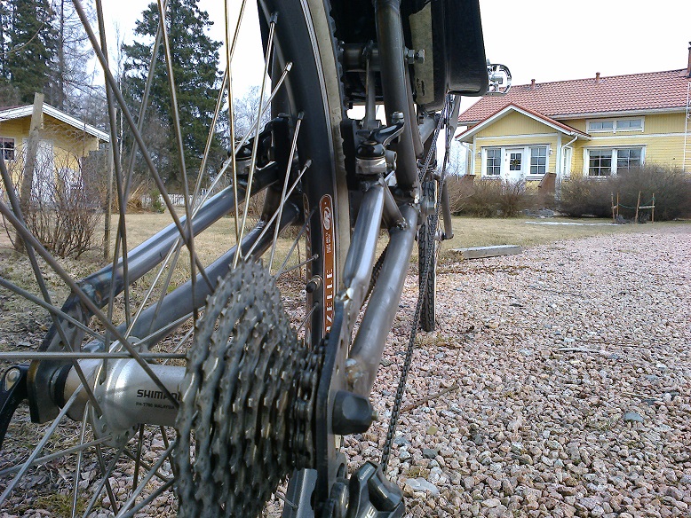 Jepjee, alkaa pyörä olla kasassa. Lokasuojien kiinnikkeet ja jarrutapit on kiinni. Lokasuojien asennus tulee tuottamaan päänvaivaa. Vielä etuvaihtajan putki ja jotain kiinnikkeitä, pulloteline yms? Tarakkaa en taida tähän tehdä. Ehkä penkin alle vois jonkunlaisen laukun kuitenkin väsätä. Olis kätevä. Pitää pyytää siskoa ompelemaan :D