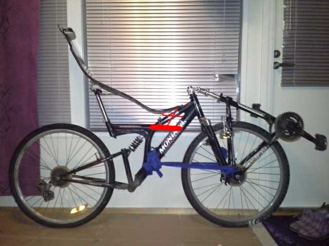 Minä kyllä keskittyisin tekemään tuosta ajokelpoisen muuttamatta runkoa mitenkään. Tuon yläputken poistaminen vaikuttaa myös emäputken liitokseen samoin jousituksen voimat on vaikea saada kiinni. Tuon putken poistamalla istuinta saa noin 30-50 mm alemmas. Maksaneeko vaivan. Jos oikeaa MBB-pyörää tehdään, pitää emäputken liitos olla vinompi ja liittyvä putki paksumpi kuin tuo nykyinen viistoputki. Istuinta saa ilmankin hiukan alemmas halkaisemalla istuinosan edestä ja upottamalla yläputki tuohon halkioon. Putki voi mainiosti nousta istuimen etuosassa istuinpintaa ylemmäksikin, onhan pystypyörällä ajellessakin haarojen välissä satulan kapea etuosa, paljon jyrkemmässä asennossa vieläpä. Jos ja kun tuo sitten osoittautuu mainioksi peliksi, voi sillä ajellessaan etsiskellä teräksistä runkoa tai alumiininhitsauspaikkaa ja harjoitella niitä kuituhommia oikeaan tarpeeseen.