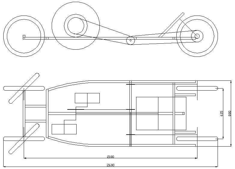 Kannatan tätä ajatusta. Ehkä pyörät voisi kääntyä yhtä paljon, niin olisi kaksiraiteinen myös kaarteessa. Etuveto nyt ilman muuta, kiertyväketjuisena ehkä helpoin toteuttaa. Tein joskus siitä mallikuvan, pitää vaan lisätä kääntyvät takapyörät: