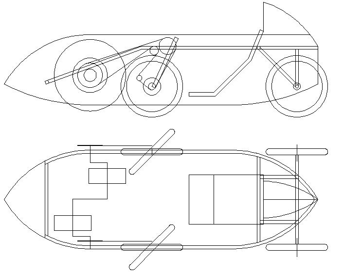 Rungo(i)sta voisi jättää alamutkan pois, koska olisi helpompi kiivetä kyytiin kun olis ylempänä käsille tukea - kuten kinnereissä kulkuaukon reunasta. Tällöin runko olisi tehtävissä suorakulmion muotoon, vrt. kaksiraiteinen kolmipyörä, eli kiertäisi poljinkammen. Varmaankin putkikoot tuon kaksiraiteisen luokkaa. Normi etuhaarukat joka pyörään, ei olisi liian vaikea tehdä? Jos tekeleen vielä kattaa, jää rumat rakenteet piiloon...
