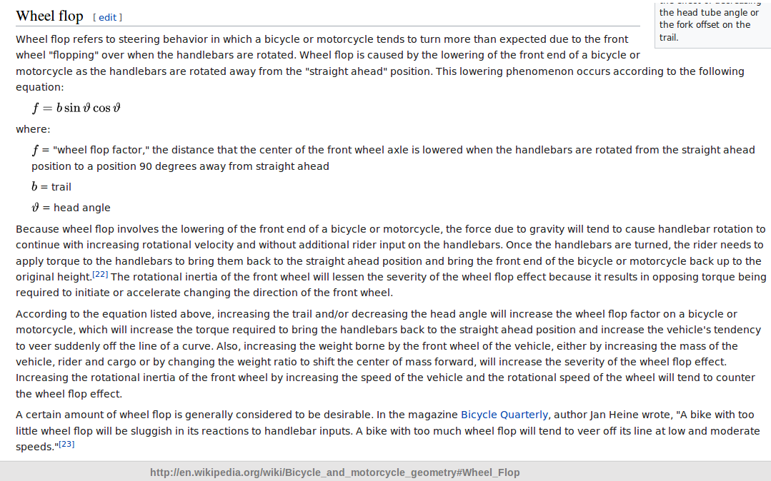 Nuohan ovat saman geometrian tuloksia molemmat. Wheel flop kasvaa, kun ohjauskulma loivenee. Jättökin kasvaa ohjauskulmaa loiventamalla, mutta pystyllä ohjauskulmalla (90 astetta) ei wheel floppia ole lainkaan.