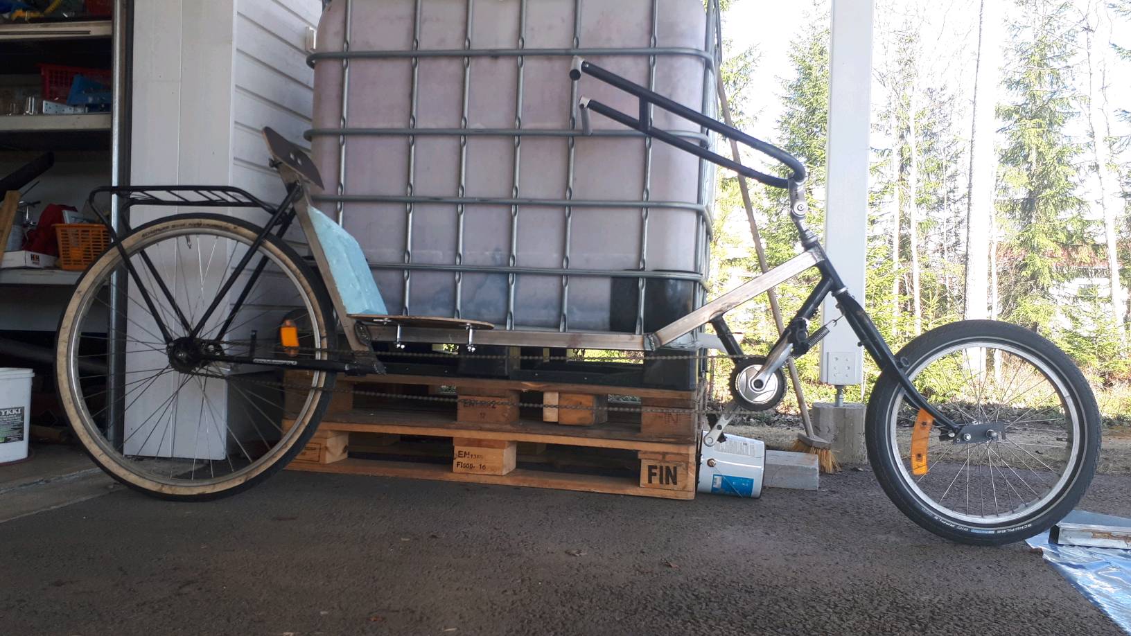 Muoks. Nyt eturengas on jo niin kaukana, että runkoa voisi lyhentää 100mm kampien ja emäputken välistä. Tarkoittaa 100mm pienempää heiluria, mutta katsotaan viitsinkö lyhentää.