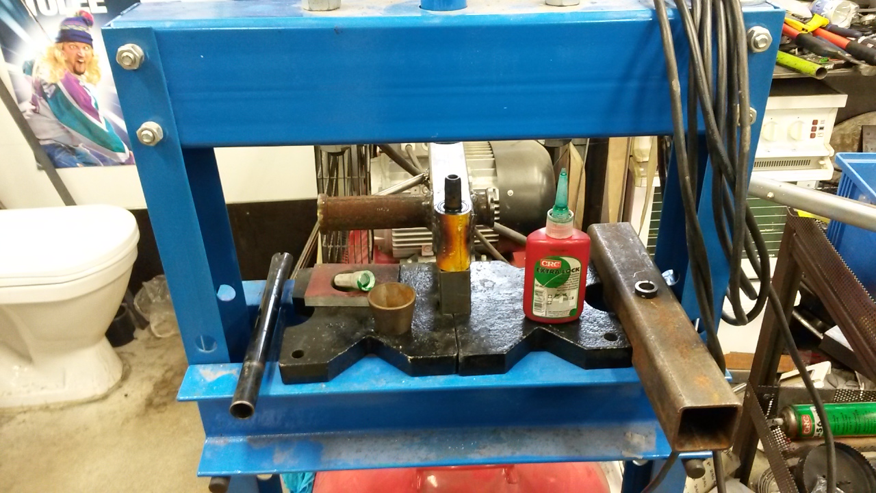 Eipä hitsauksen jälkeen enää vasaralla naputtelu riittänyt. Prässi avuksi ja laakerilukite väliin.