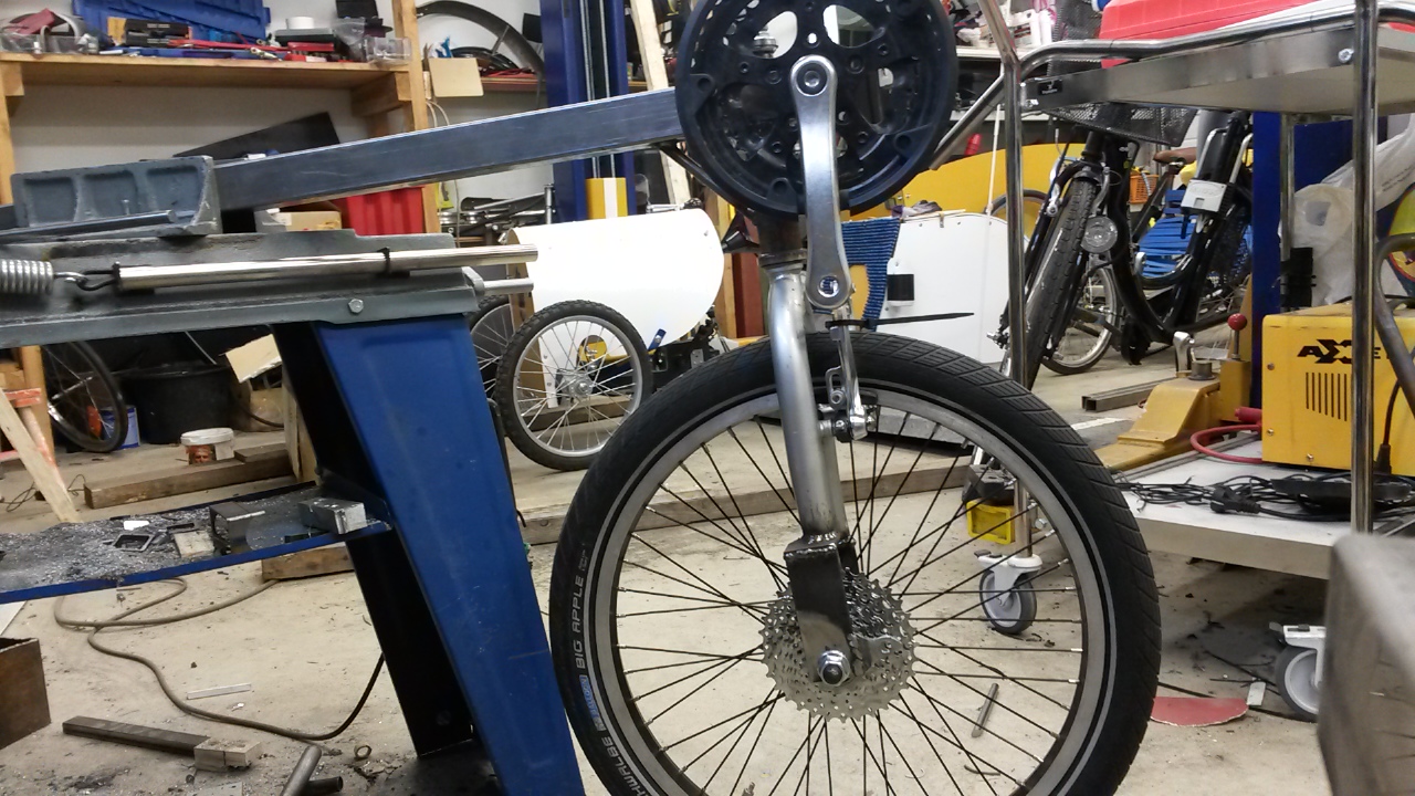 Periaatteessa sama tilanne, mutta: Viljamilla on leveämpi haarukka ja tarvitaan suurempi kääntökulma koska trike. Lisäksi taittopyörä laitetaan yleensä niin lähelle runkoa kuin pystyy, polvikontaktin välttämiseksi. Keskiörattaat tulevat enemmän ulospäin ja vievät ketjua lähemmäs kääntyvää haarukkaa. Tilanne paranee kun keskiötä siirtää taaksepäin, mutta ketjulinja ei enää olisi samansuuntainen kuin ohjausakseli (keskimäärin). Suo siellä vetelä täällä. Mutta saattaa se silti onnistua noinkin, halusin vaan kiinnittää huomiota tähän että tulee huomioitua.